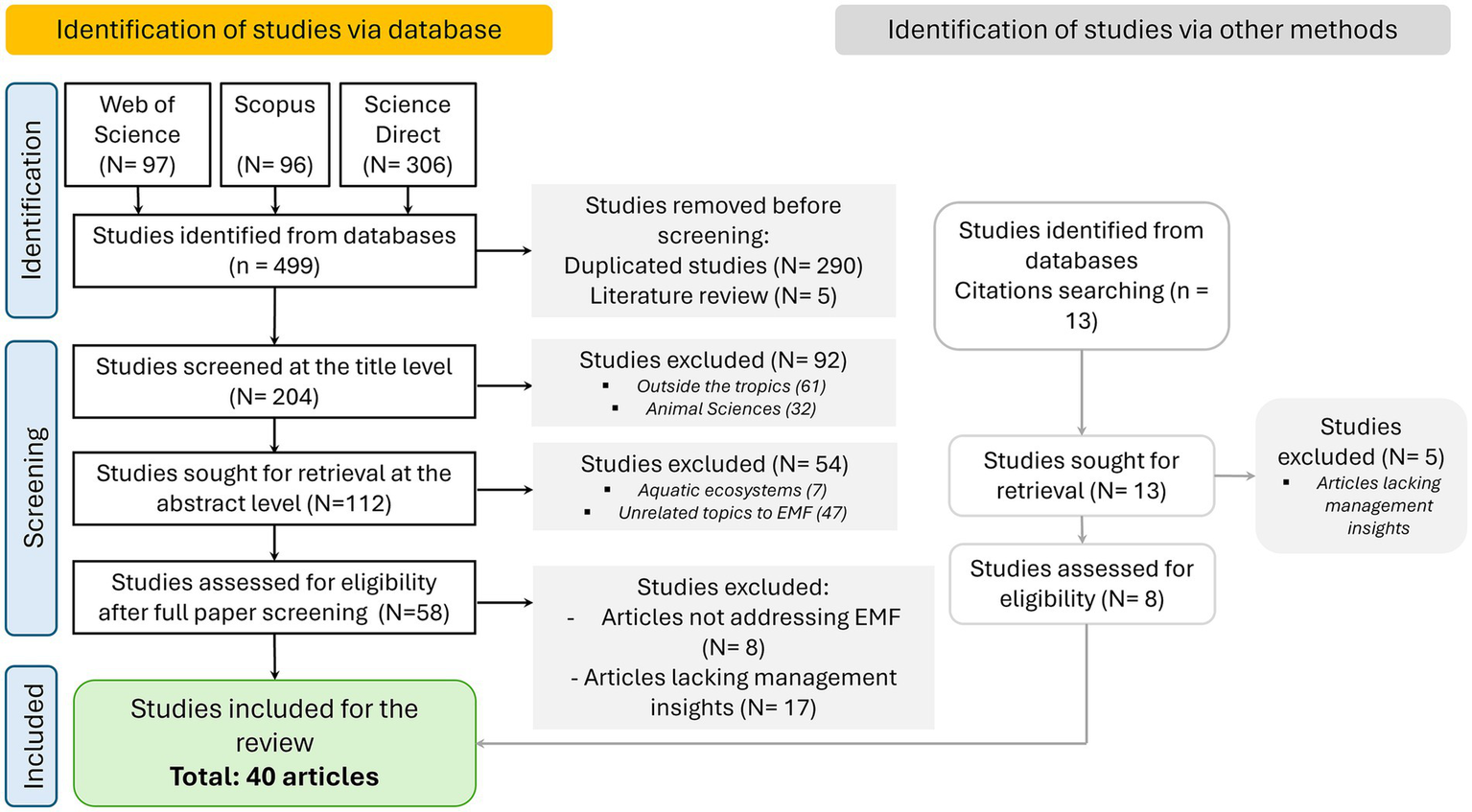 In this systematic literature review, we explored publications on EMF with a specific focus on terrestrial tropical ecosystems. Our review followed the Protocol, Search, Appraisal, Synthesis, Analysis, and Reporting approach. This six-step approach is recognized for its comprehensive, systematic, and reproducible nature, minimizing bias and enhancing the reliability of findings (Haddaway et al., 2020).