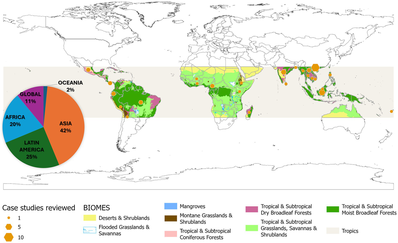 The 40 articles analysed captured about 64 different case studies reviewed in the tropics and distributed according to ecoregions as described by Dinerstein et al. (2017) and Figure 3.