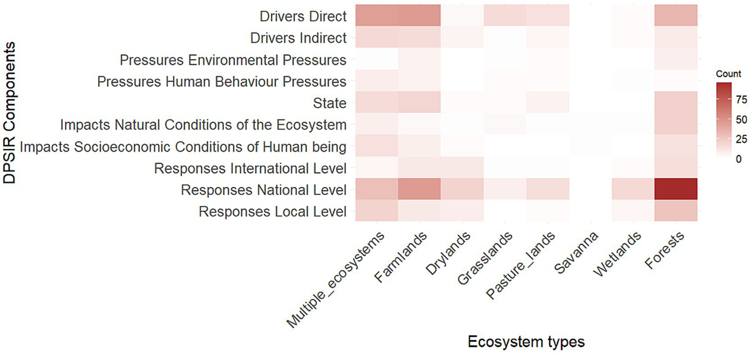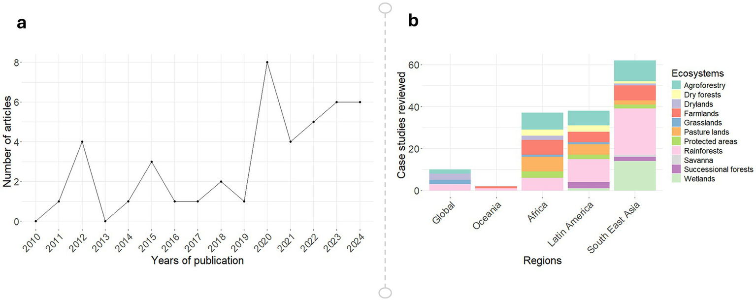 The reviewed articles encompass studies across diverse ecosystems such as forests, drylands, pastures, and integrated landscapes combining forests with farmlands and pastures. The case studies reviewed were categorized per year of publication and ecosystem types (Figure 4).