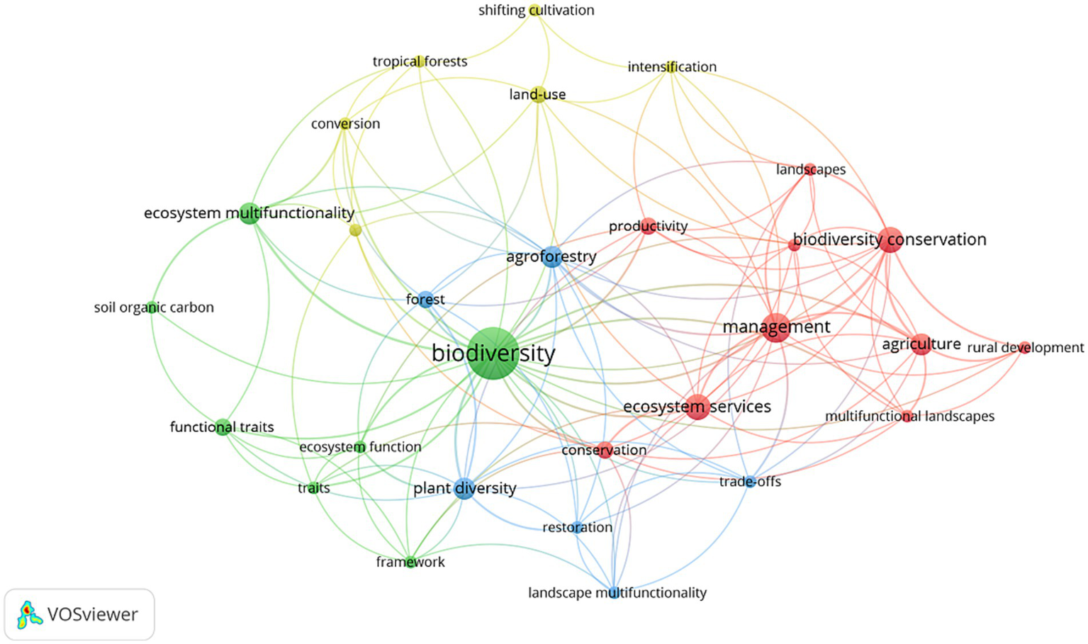 The bibliographic network analysis displayed four nodes or clusters: (i) Biodiversity; (ii) Management; (iii) Agroforestry and (iv) Land-use (Figure 5). The biodiversity cluster, the largest in the network, emphasizes the central role of ecological components in EMF studies, particularly ecosystem functions, plant functional traits, and soil organic carbon. Its size and connectivity highlight biodiversity as the foundation for understanding multifunctionality in tropical systems. The management cluster serves as a bridge, linking practices, such as biodiversity conservation, ecosystem services, and multifunctional landscapes. This suggests that management practices are frequently framed as linking ecological processes and policy or governance interventions. The agroforestry cluster connects ecological restoration, landscape multifunctionality, and sustainable forest management, indicating growing recognition of agroforestry as a multifunctional land-use strategy. Finally, the land-use cluster, though smaller, links to various land-use practices and captures debates on shifting cultivation, agricultural intensification, and conservation strategies, reflecting the tensions between production-oriented practices and ecological sustainability. These clusters highlight a dynamic research environment where biodiversity is fundamental to EMF. Moreover, studies on land use and agroforestry uncover intriguing trade-offs co-benefits, and new opportunities contributing to a more comprehensive understanding of EMF within social-ecological contexts.