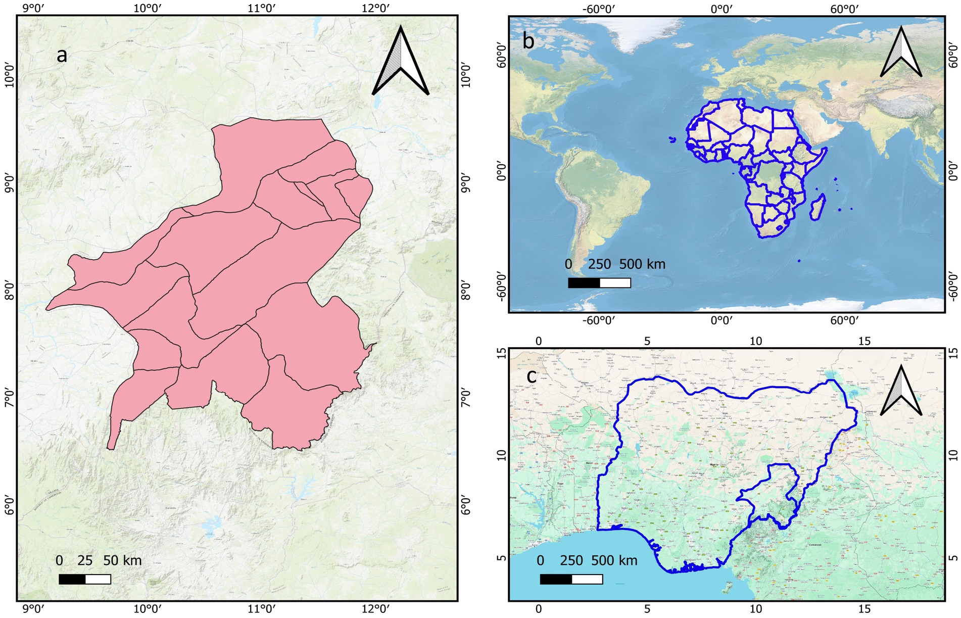 Figure 1. (a) Shows the location of Taraba State; (b) African continent showing 54 countries; (c) Nigeria’s map where the study area is located.