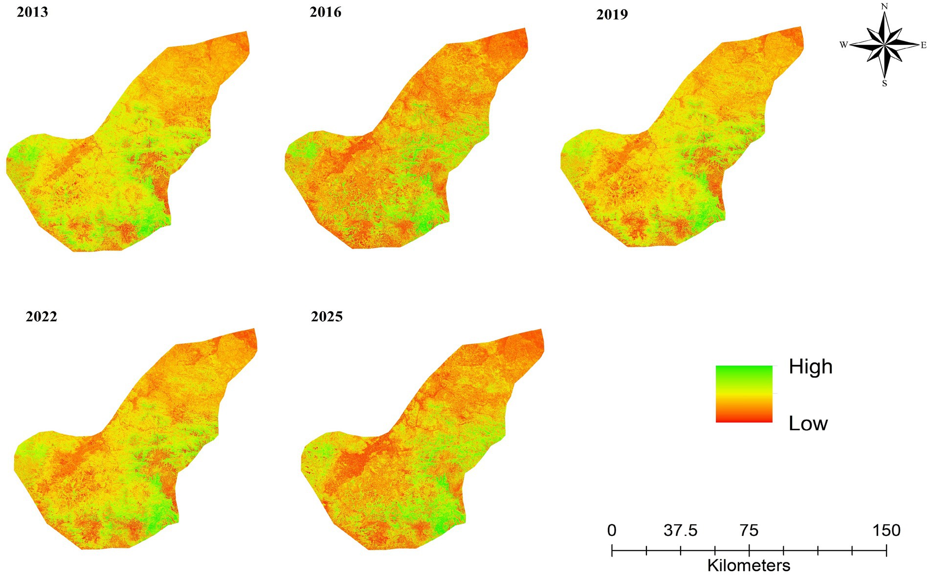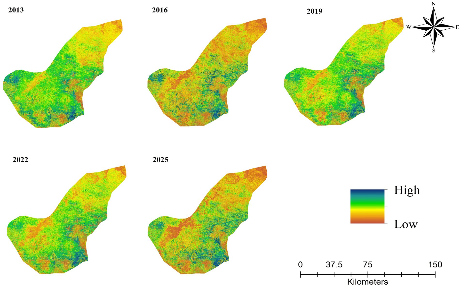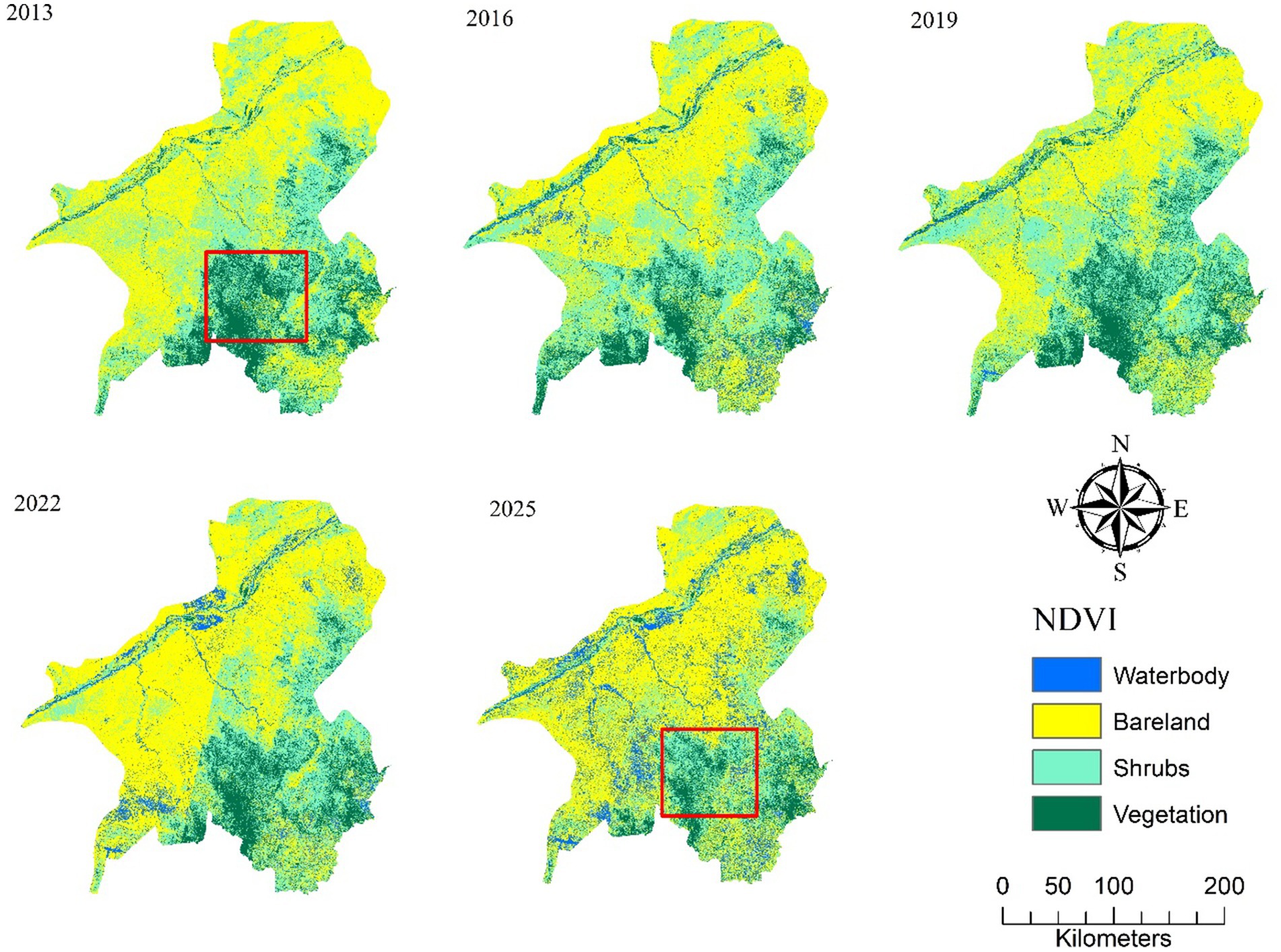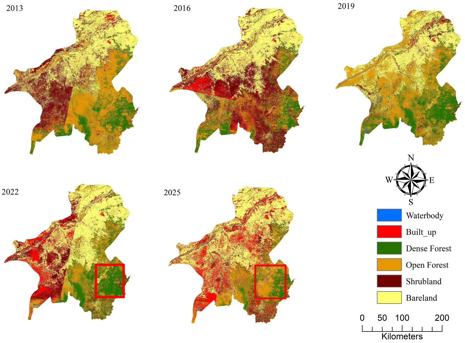Remote sensing has become an indispensable tool for monitoring changes in forest cover, vegetation health, and land use/land cover (LULC) (Mashala et al., 2023; Olorunfemi et al., 2020; Twisa and Buchroithner, 2019). Among the most widely applied indices, the Normalized Difference Vegetation Index (NDVI), derived from satellite imagery, has proven highly effective in assessing vegetation health, productivity, and forest cover dynamics (Akbar et al., 2020; Robinson et al., 2017; Zaitunah et al., 2018). NDVI has been extensively used to monitor forest dynamics (Hansen et al., 2013), evaluate deforestation trends (Townshend et al., 2012), and estimate carbon stocks in tropical regions (Glennie and Anyamba, 2018; Saatchi et al., 2011). Long-term NDVI analysis enables researchers to capture spatial and temporal variations in forest ecosystems, thereby offering critical insights into the impacts of human activities and climate change.