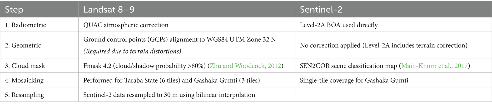 Taraba State, located in northern Nigeria, is bordered by Adamawa, Benue, Plateau, Bauchi, and Gombe states, and shares an international boundary with Cameroon to the east. Covering approximately 54,000 km2 (Figure 1a), the state lies within Nigeria’s Middle Belt and encompasses diverse landscapes, including tropical forests, savannas, and wetlands (Mayomi and Yohanna, 2019). It supports rich biodiversity, most notably within Gashaka-Gumti National Park—the largest in Nigeria—which harbors species such as chimpanzees and elephants. The Mambila Plateau, situated in the southeastern part of the state, is characterized by montane forests and a cooler climate. Taraba experiences a tropical climate with distinct wet (April–October) and dry seasons. In the lowlands, annual rainfall ranges from 1,000 to 1,500 mm, with temperatures varying between 20 °C and 33 °C, while on the Mambila Plateau, temperatures may fall to around 15 °C during the dry season (Adebayo and Oruonye, 2013).
