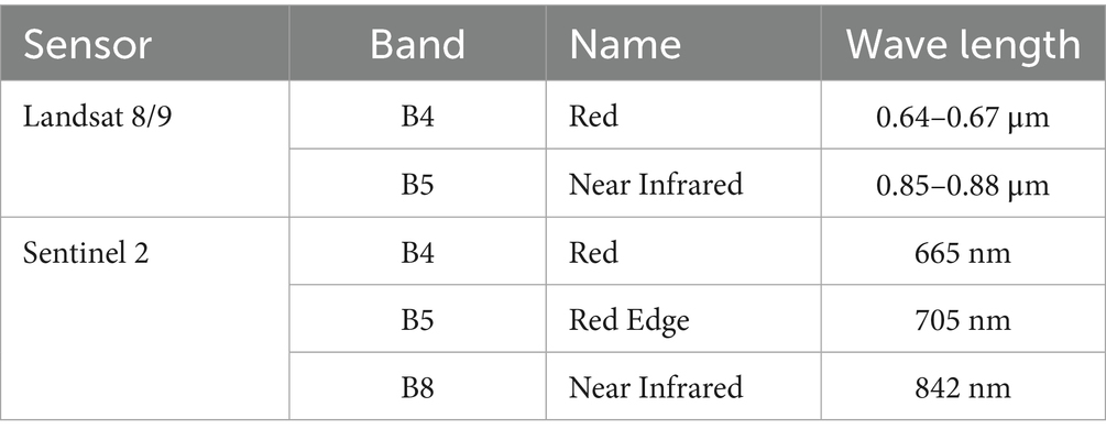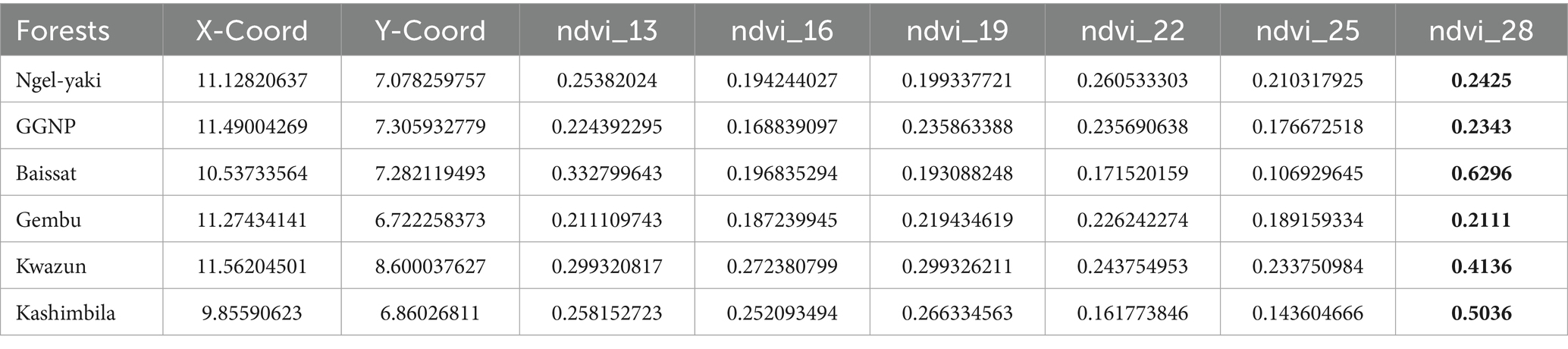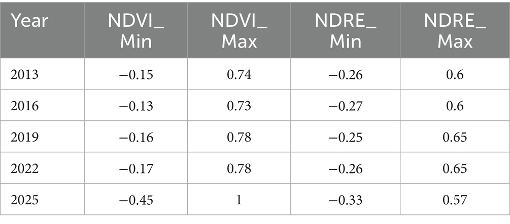 Although NDVI is widely used for monitoring vegetation cover, it has limitations in dense forests where canopy structures can distort reflectance signals (Chu and Guo, 2013; Ecke et al., 2022; Vélez et al., 2023). To address these limitations, the Normalized Difference Red Edge (NDRE) index has gained prominence for assessing chlorophyll concentration and nitrogen levels in vegetation canopies (Easterday et al., 2019; Sims and Gamon, 2002; Zhao et al., 2025). While NDRE is primarily employed to evaluate photosynthetic activity rather than vertical stratification, its sensitivity to upper canopy properties (Gitelson et al., 2005) provides a valuable complement to NDVI for comprehensive vegetation assessment. In this study, NDRE is applied alongside NDVI to capture differential responses to environmental stressors between canopy species (dominant upper-layer trees) and non-canopy species (understory vegetation) in Taraba’s multi-layered forests (Abiem et al., 2023; Adedibu et al., 2022; Garkida et al., 2024). Recent studies in comparable ecosystems further highlight NDRE’s potential in detecting stress responses across vegetation strata (Adelabu et al., 2014; Hamada et al., 2023).
