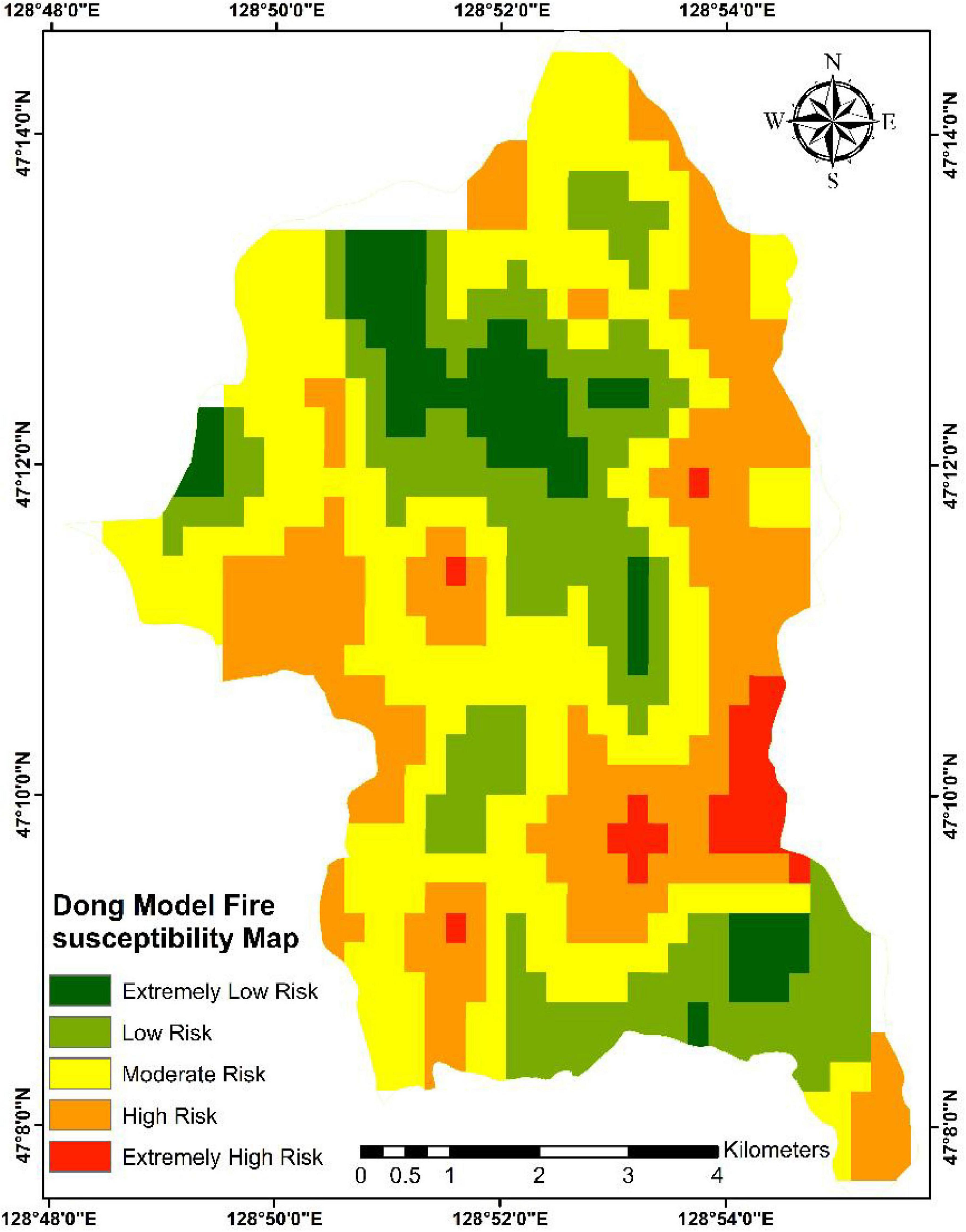 Where x1, x2, x3…x10 represent the normalized values of the factors and ω1, ω2, ω3 … ω10 are their respective weights. The Dong model’s fire risk classification categorizes FRI values into five risk levels, ranging from extremely low to extremely high. The fire risk map is generated using the ArcGIS Raster Calculator, and risk zones are visually represented with distinct colors. The fire risk map is compared with Terra’s Thermal Anomalies and Fire data to validate the model. The Dong model is widely applied due to its effective integration of multiple risk factors into a simple yet reliable fire risk assessment framework.