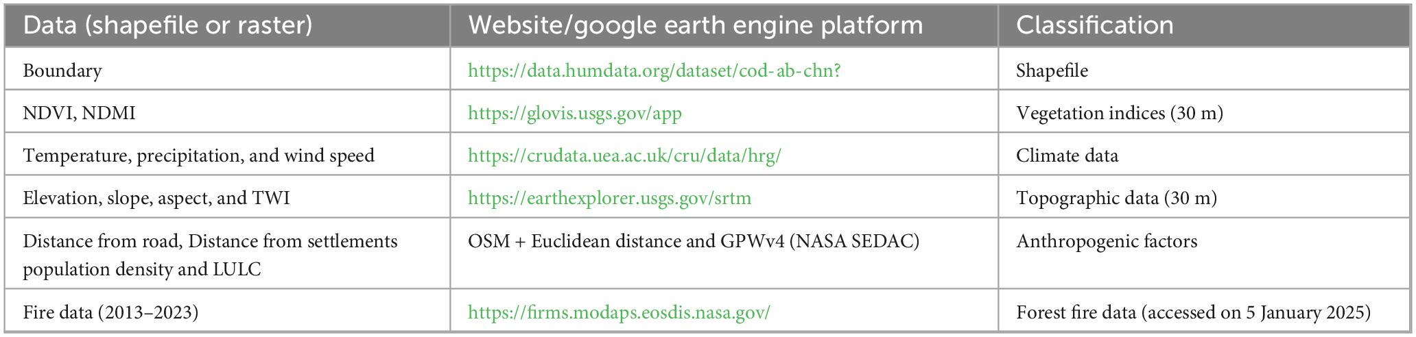 According to the China Forestry Administration, forest fires in China have exceeded 10,000 annually over the past decade, with general fires (less than 1 hectare) and larger fires (1–100 hectares) causing notable social and environmental consequences (Yang et al., 2015). Northern regions, especially the Northeast, experience particularly severe wildfires due to the vast natural forest cover and distinctive climatic conditions (Wang et al., 2023). Conventional fire vulnerability methods, such as logistic regression, fuzzy analysis, and neural networks, typically rely on historical fire data for validation. However, in regions like the Liangshui National Nature Reserve, where historical fire data is sparse or incomplete, these approaches may result in limited model generalizability and reduced predictive performance due to insufficient validation inputs. To address this, we will develop a Fire Risk Index (FRI)-based model that enables the creation of reliable fire risk maps without depending on historical fire records. Fire points were extracted for validation using the MODIS temperature anomaly and fire. This method has shown over 90% accuracy in identifying fire locations (Zhao et al., 2008). In our study, fire points were identified between 2013 and 2023 and used to evaluate the model’s performance.