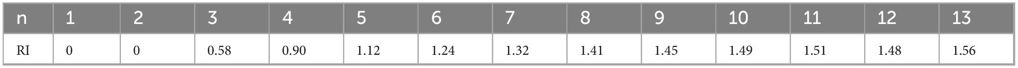 where n is the number of classes. CR should be less than 0.10 for consistent weights. The Random Index (RI) value is referred to in Table 3.