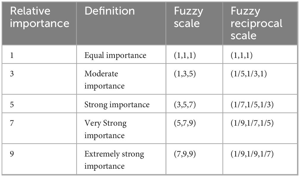 The F-AHP is an advanced decision-making tool that extends the traditional AHP method by incorporating fuzzy logic theory to handle uncertainty, imprecision, and vagueness in expert judgments using Triangular Fuzzy Numbers (TFNs) (Shapiro and Koissi, 2017, Tesfamariam and Sadiq, 2006). F-AHP addresses issues such as null weights for factors and scores for alternatives using TFNs, thereby preserving consistency in the results. Fuzzy AHP simplifies computation and enhances decision-making by handling uncertainty in expert judgments, making it well-suited for complex tasks like fire risk assessment (Yuen, 2014). F-AHP enhances traditional AHP by employing fuzzy set theory to manage imprecise data, thereby providing a more robust framework for assessing risk factors and expert opinions in uncertain environments. The fundamental scale for F-AHP is explained in Table 4. The following were the crucial steps in the F-AHP modeling process:
