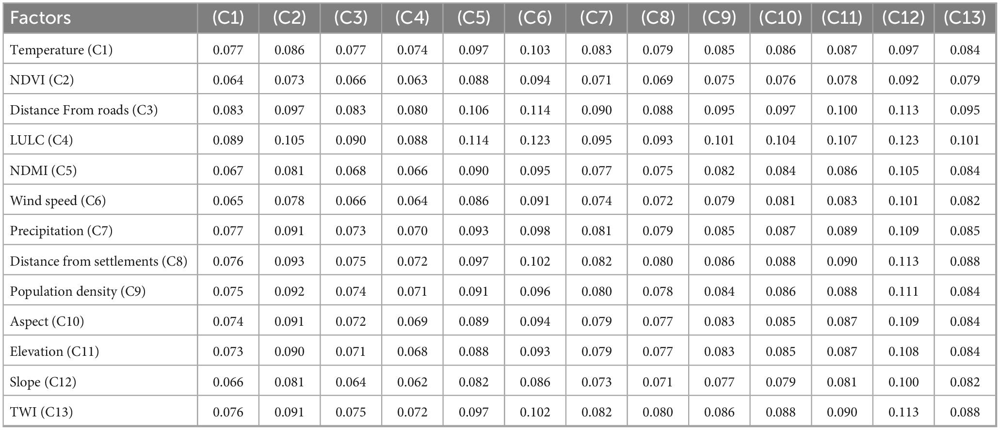 Thirteen key criteria were selected for FFR assessment: aspect, elevation, slope, topographic wetness index, proximity to roads, distance to settlements, population density, temperature, LULC, precipitation, wind speed, NDVI, and NDMI. Based on Saaty’s Scale, expert judgment was used to produce a pairwise comparison matrix that ranked the relevance of each criterion compared to the others (Table 8). Each column of the matrix was normalized, and the average value of each row was computed to derive the final weights of each criterion, as explained in Tables 9, 10. The principal eigenvalue (λmax) was computed, followed by the Consistency Index (CI) and the Consistency Ratio (CR). A CR value below 0.1 indicated an acceptable level of consistency. The weighted overlay method applied the computed weights to raster layers in ArcGIS. The resulting fire risk map represented the final output of the Fuzzy AHP. The final FFR map was generated from the normalized weights through a linear weighted combination, split into five classes using the natural break method (Figure 5).
