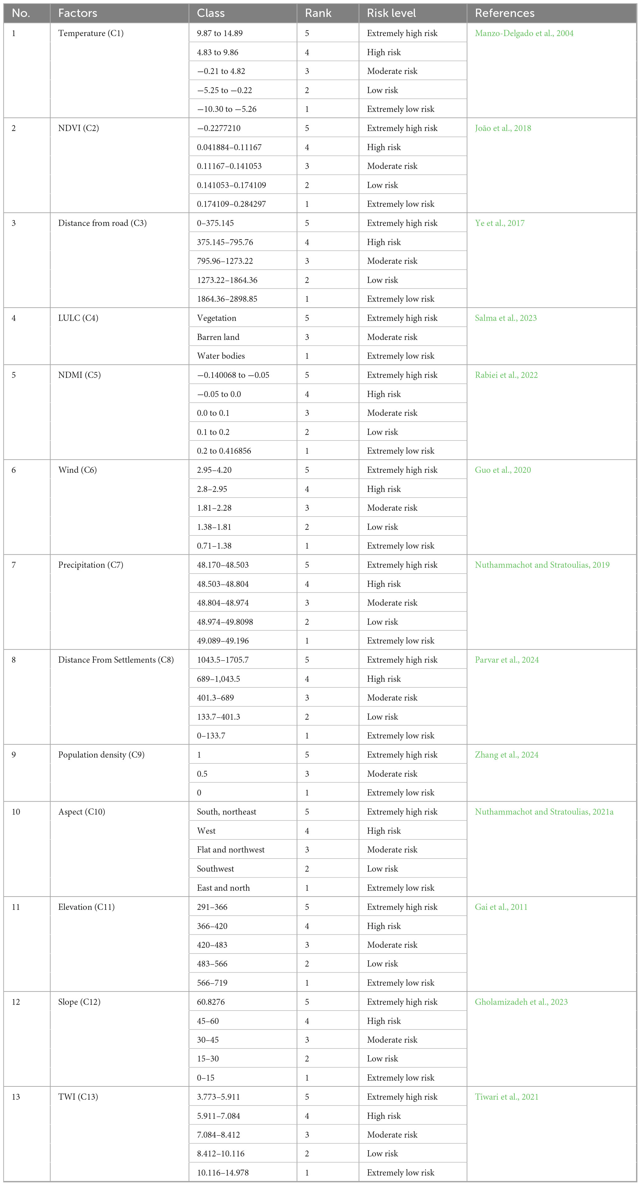 The rank value (Cf) represents the relative contribution of each factor class to fire risk and is assigned based on expert judgment. These values are then integrated with the normalized weights (NWt) in the weighted linear combination model to compute the Forest Fire Risk (FFR) index.