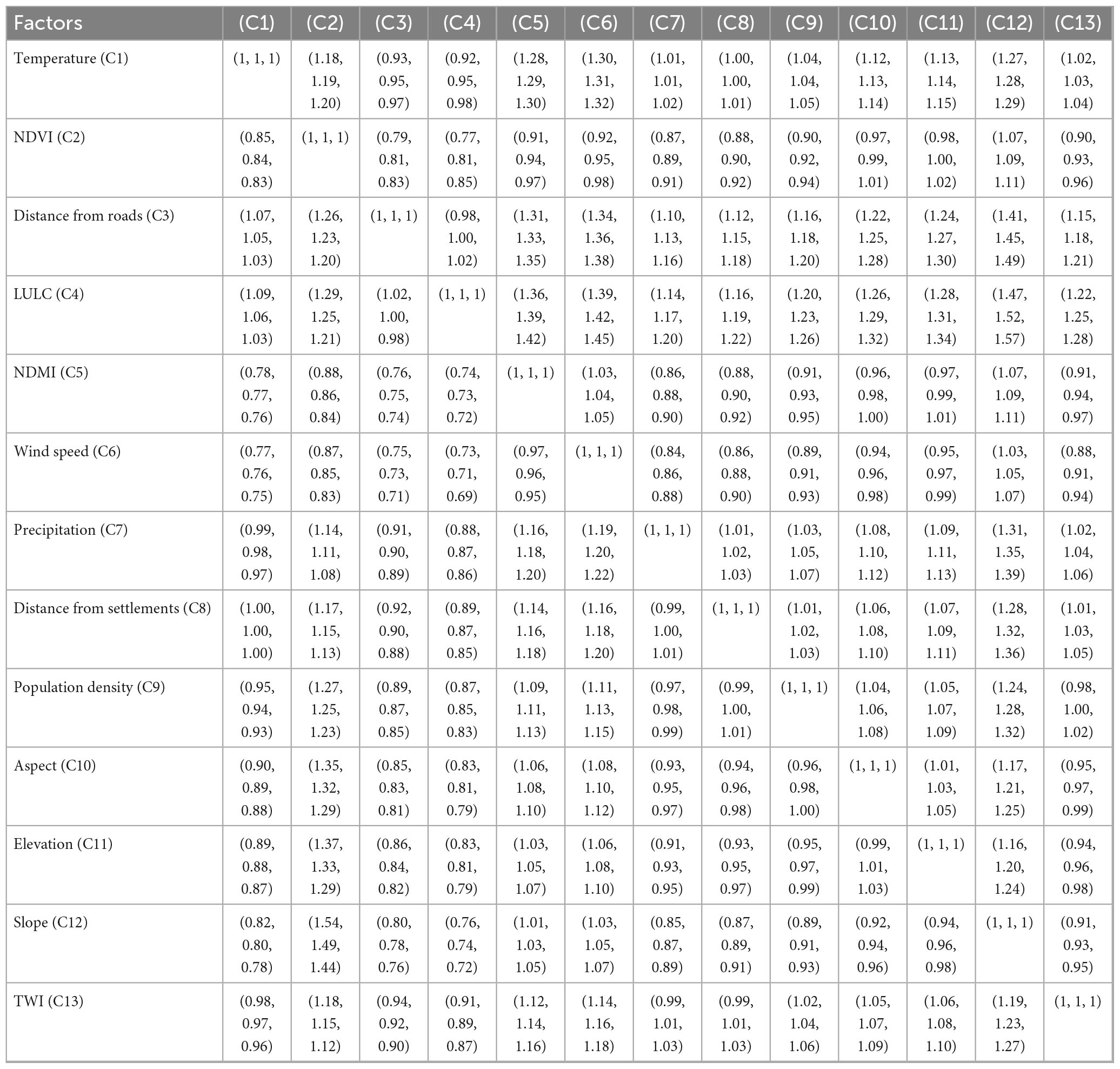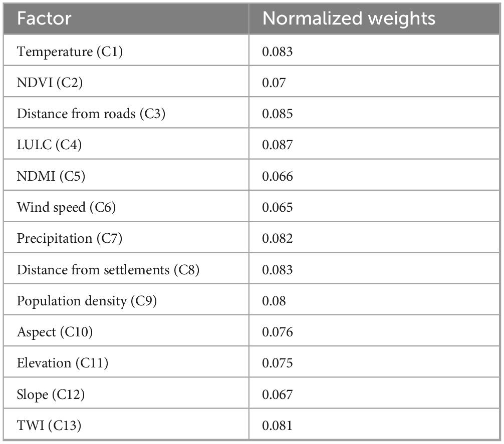 This study employs the AHP to evaluate wildfire risk factors in the Liangshui National Nature Reserve. Using a pairwise comparison approach, the AHP methodology allowed us to systematically assess factors, including aspect, elevation, slope, topographic wetness index, proximity to roads, distance to settlements, population density, temperature, precipitation, wind speed, NDVI, and NDMI (Table 5). After pairwise comparison, each factor was then normalized (Table 6).