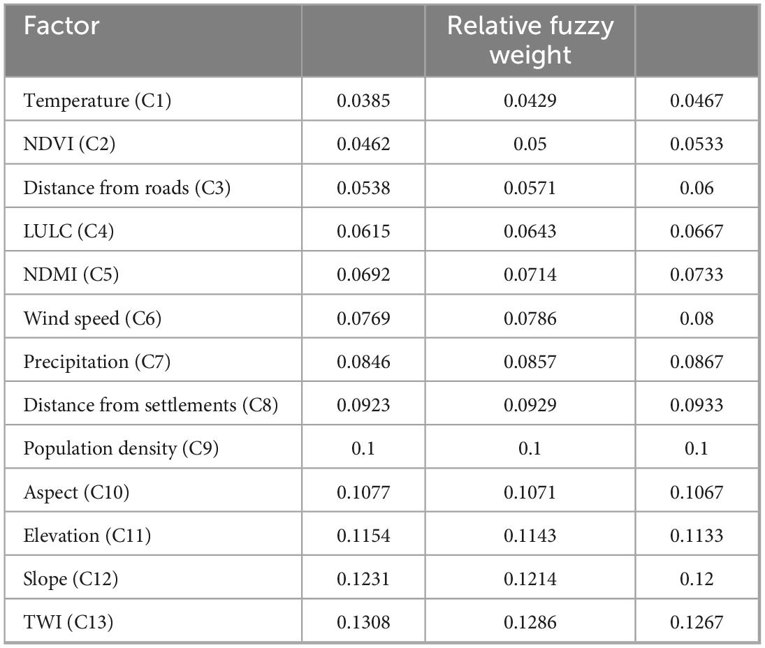 A heatmap comparison of weight values assigned to 13 decision-making criteria using three multi-criteria decision-making models: AHP, Fuzzy AHP, and the Dong Model. Each factor denotes the weight assigned to a criterion by a specific model, with both the numerical value and color intensity indicating the level of importance. For instance, LULC consistently receives the highest weight across all models (AHP: 0.09, Fuzzy AHP: 0.087, Dong Model: 0.083), as indicated the underscoring its dominant role in forest fire risk assessment. In contrast, NDMI and Wind Speed exhibit comparatively lower weights across all models. This suggests that while they may influence fire risk, they are considered less critical relative to other factors such as Distance from Roads, Distance to Settlements, and Precipitation, which display moderate to high weights (ranging from 0.077 to 0.085). Overall, the Figure 7 reveals a high degree of consistency among the three methods, particularly in the ranking of top contributing factors such as LULC, Distance from Roads, and Settlements. However, slight variations in weights (e.g., Temperature and NDVI) reflect each method’s underlying computational approach and sensitivity to pairwise judgments or data fuzziness.