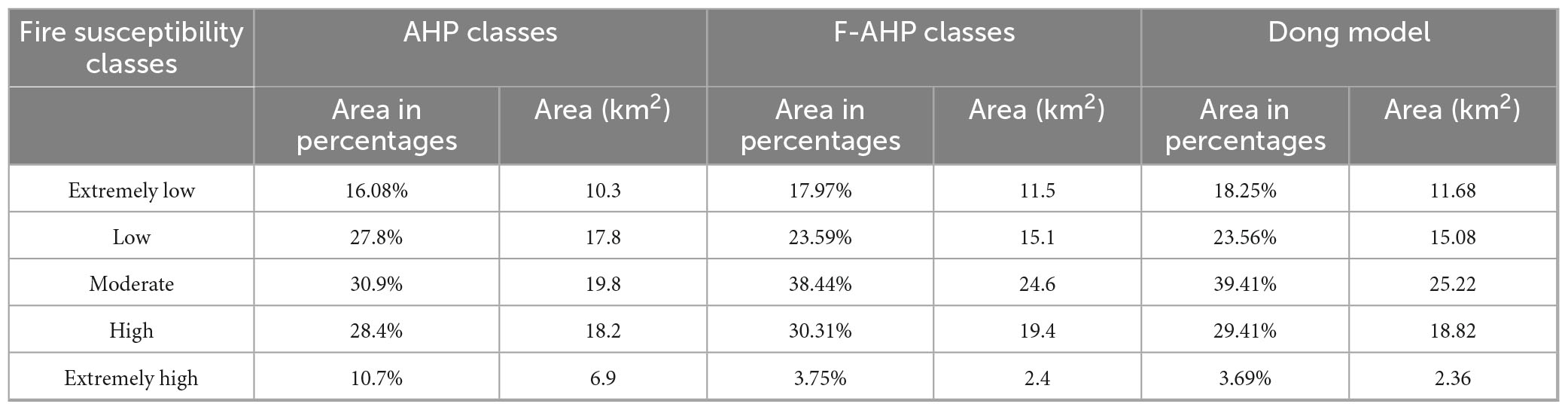The Geographic Information System (GIS)-based Analytical Hierarchy Process (AHP) (Jia et al., 2019; Hong et al., 2019; Chuvieco and Congalton, 1989). Fuzzy AHP and the Dong model (Nikolić et al., 2023; Eskandari and Miesel, 2017; Kumi-Boateng et al., 2021) have proven to be effective tools for generating forest fire risk (FFR) maps. When used in combination, these methodologies offer valuable support for fire authorities in both preventing wildfires and promoting sustainable post-fire land management (Nuthammachot and Stratoulias, 2021b). One of the most popular techniques in Multi-Criteria Decision Analysis (MCDA), the AHP, combined with GIS approaches, has been widely effective in identifying fire danger zones globally (Rahmati et al., 2015; Pourghasemi et al., 2016). AHP is a structured decision-making tool that is particularly effective in environments where expert opinion plays a crucial role. At the same time, F-AHP addresses the uncertainty inherent in fire risk modeling using fuzzy logic. Though less explored, the Dong Model offers a parameter-based approach with spatial adaptability (Kayet et al., 2018; Eskandari and Miesel, 2017). For example (Fekir et al., 2022) employed and compared two models i.e., (AHP) and Dong considering three effective factors including topography, vegetation cover and anthropogenic integrated by these two methods in Algeria. Forest fire risk zonation prepared by AHP and Dong Model was compared with burn severity map. The result after statistical calculation demonstrated that a significant portion of the burned area is classified within the moderate, high, and very high-risk zones, with rates of 64.27% for the Dong model and 69.41% for the AHP model. Sinha et al. (2023) also employed geospatial tools, specifically the AHP and fuzzy AHP models, for analysis. The purpose of this different zone selection was to assess the effectiveness of the models by taking the forest fire responsible factors. The selected sites for this research and application of modeling were severely hit by almost 100 forest fire events in history.
