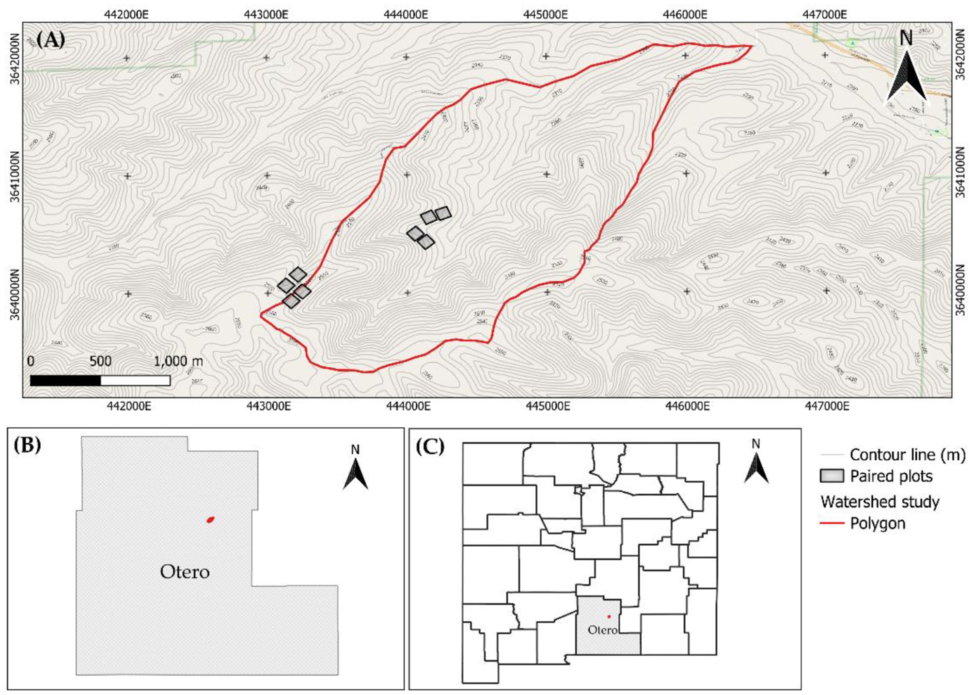 Figure 1. Location of the study site. (A) Watershed study area showing paired plots, (B) location of the study site in Otero County within the State of New Mexico (C).