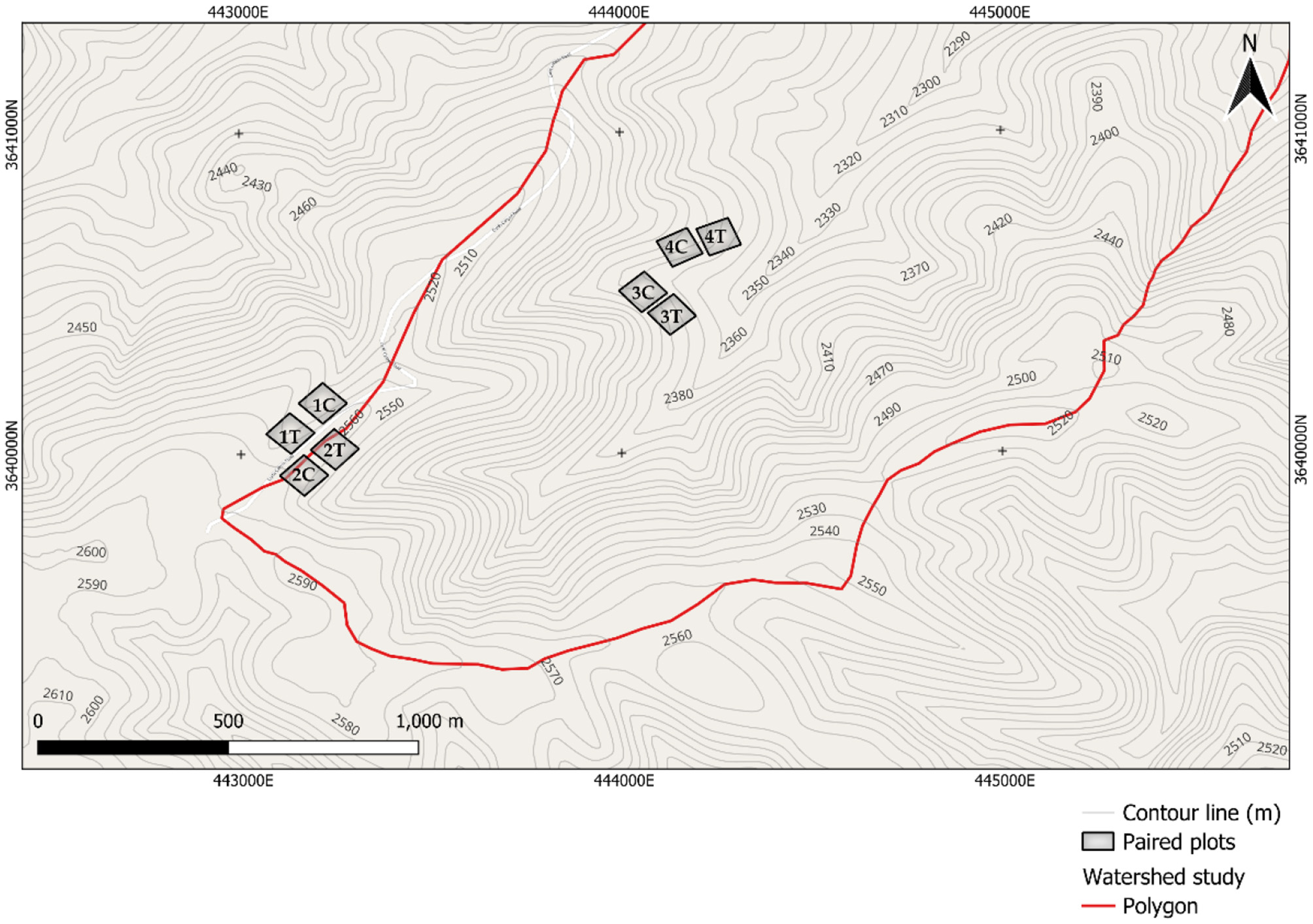 Figure 2. The watershed study area shows paired plots at the ridge (1 and 2) and the valley (3 and 4). Letters within plots indicate thinned plots (T) and control plots (C).