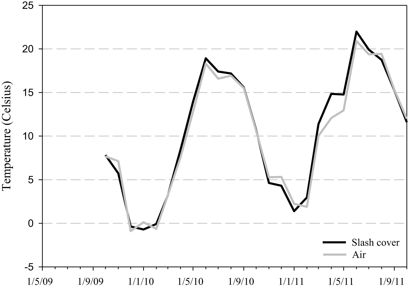 The variability of slash cover temperature and air temperature followed a seasonal trend characterized by a gradual rise and decline according to the seasons. The highest slash cover temperature and air temperature were recorded in June 2011 (22 °C and 21 °C, respectively). The lowest slash cover temperature and air temperature below zero were obtained from December 2009 through February 2010, except for January, with an air temperature above zero (Figure 4).