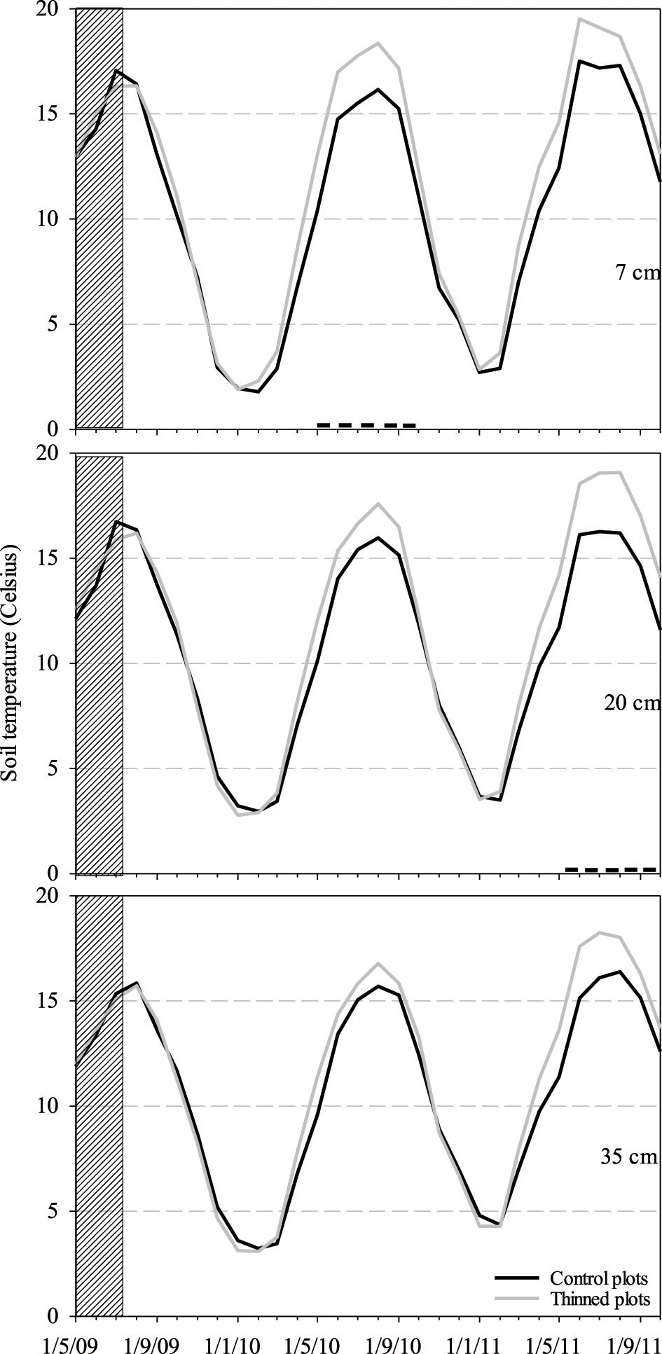 Figure 5. Monthly average soil temperature at three different depths. The statistical significance is represented by the black bold minus symbol. The vertical rectangle (hatched area) depicts the pre-treatment season.