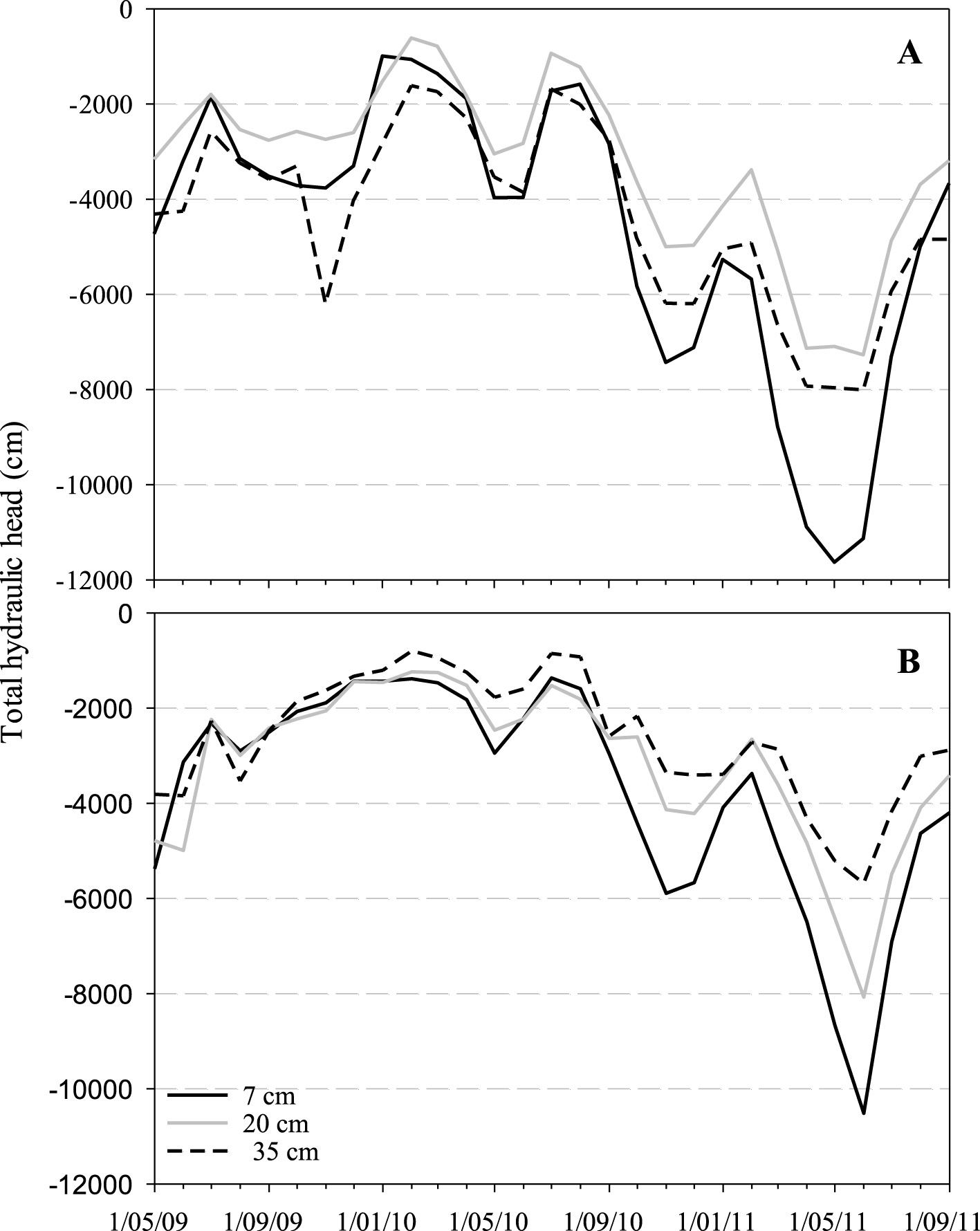 Figure 7. Monthly total hydraulic head (cm) across depths in control plots (A) and thinned plots (B).