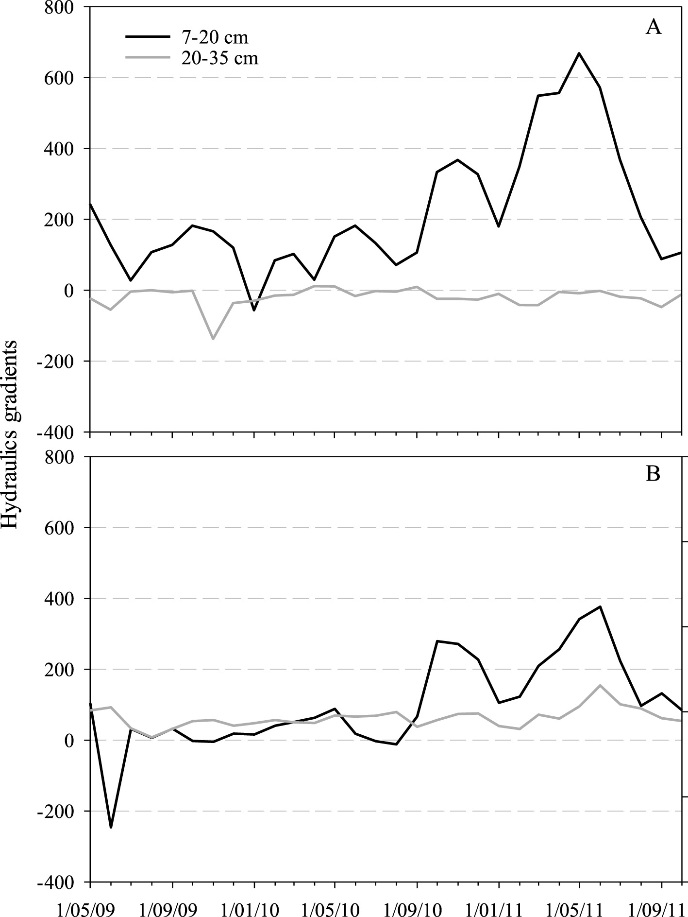 In thinned plots, after the thinning treatment, the hydraulic gradient was positive at both depths (7–20 cm and 20–35 cm) even during low precipitation (February through June 2010 and from October 2010 to the first week of July 2011) (Figure 8B). At 7–20 cm depth, the hydraulic gradient increased steadily from October 2009 through May 2010. Henceforward, the hydraulic gradient had a sharp decrease until August 2011. At 20–35 cm depth, it remained relatively stable with small variation. During the described period, at both depths, water flow was from the high total head to the low total head as confirmed by the hydraulic head results (Figure 7B).