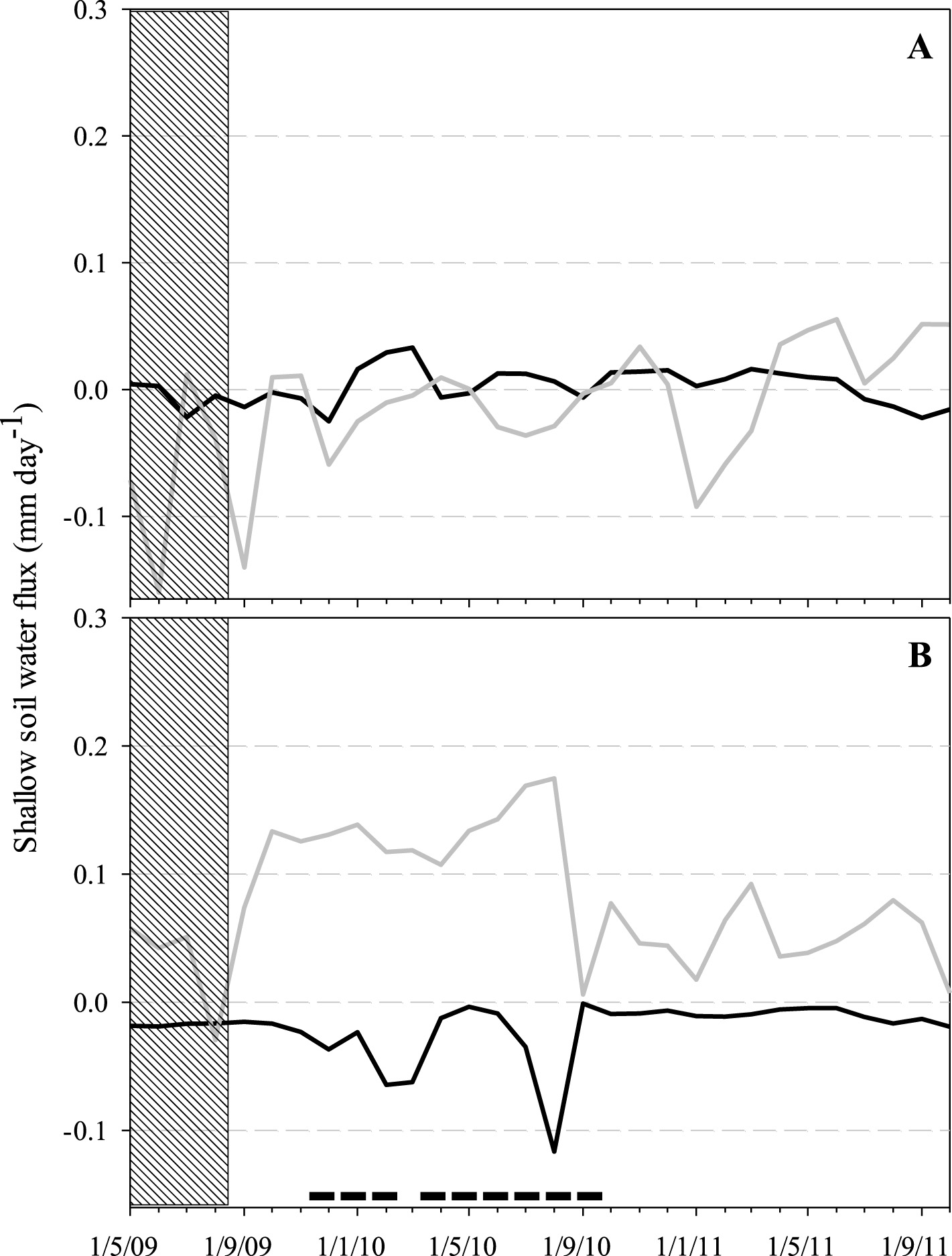 Figure 9. Shallow soil water flux at 7-20 cm depth (A) and 20-35 cm depth (B). The solid black and gray lines represent control and thinned plots, respectively. The bold black minus symbol depicts statistical significance. The vertical rectangle (hatched area) depicts the pre-treatment season.