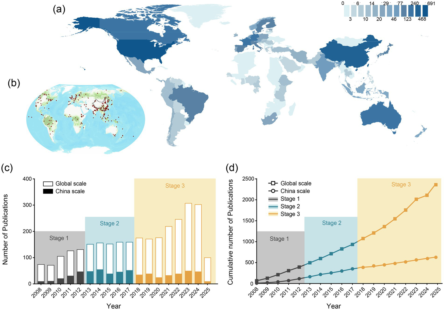 Analysis of publications related to forest carbon stock estimation techniques. (a) Global distribution of study regions. Deeper blue indicates areas with a relatively higher number of published papers. (b) The geographical distribution of research sites extracted from the related literature. The green areas represent global forest coverage, sourced from ArcGIS online maps. The red points represent the distribution of latitude and longitude coordinates for research sites extracted from the related literature. (c) Annual number of publications. (d) Cumulative number of publications. The differently colored boxes represent the three phases of development in forest carbon stock estimation techniques (2008–2012, 2013–2017, and 2018–2025).