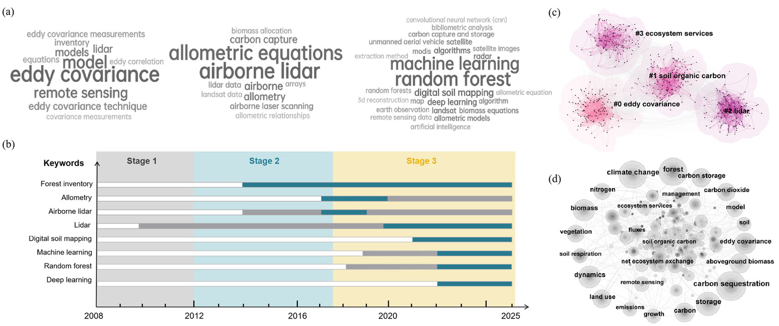 The keyword category was divided into four main clustering groups, with each cluster containing 103–140 keywords (Figure 5c). These clusters were ranked by their co-citation frequency, which included: (1). A cluster related to EC, covering 140 keyword nodes such as ML, spatial heterogeneity, and C budget, and with an S value of 0.8; (2). The soil organic C cluster, including digital soil mapping, RF, and other key technologies; (3). A cluster centered on radar technology, encompassing RS and airborne LiDAR, etc.; (4). A group representing ecosystem services, including forest logging and forest management (Figure 5c; Supplementary Table S7). Overall, “C sequestration” appeared as the most frequently mentioned keyword, occurring 299 times. “Forest” and “Climate change” appeared 276 and 264 times, respectively. In addition, “Storage” (210 times), “biomass” (176 times), and “EC” (162 times) also appeared as significant keywords (Figure 5d; Supplementary Table S8).