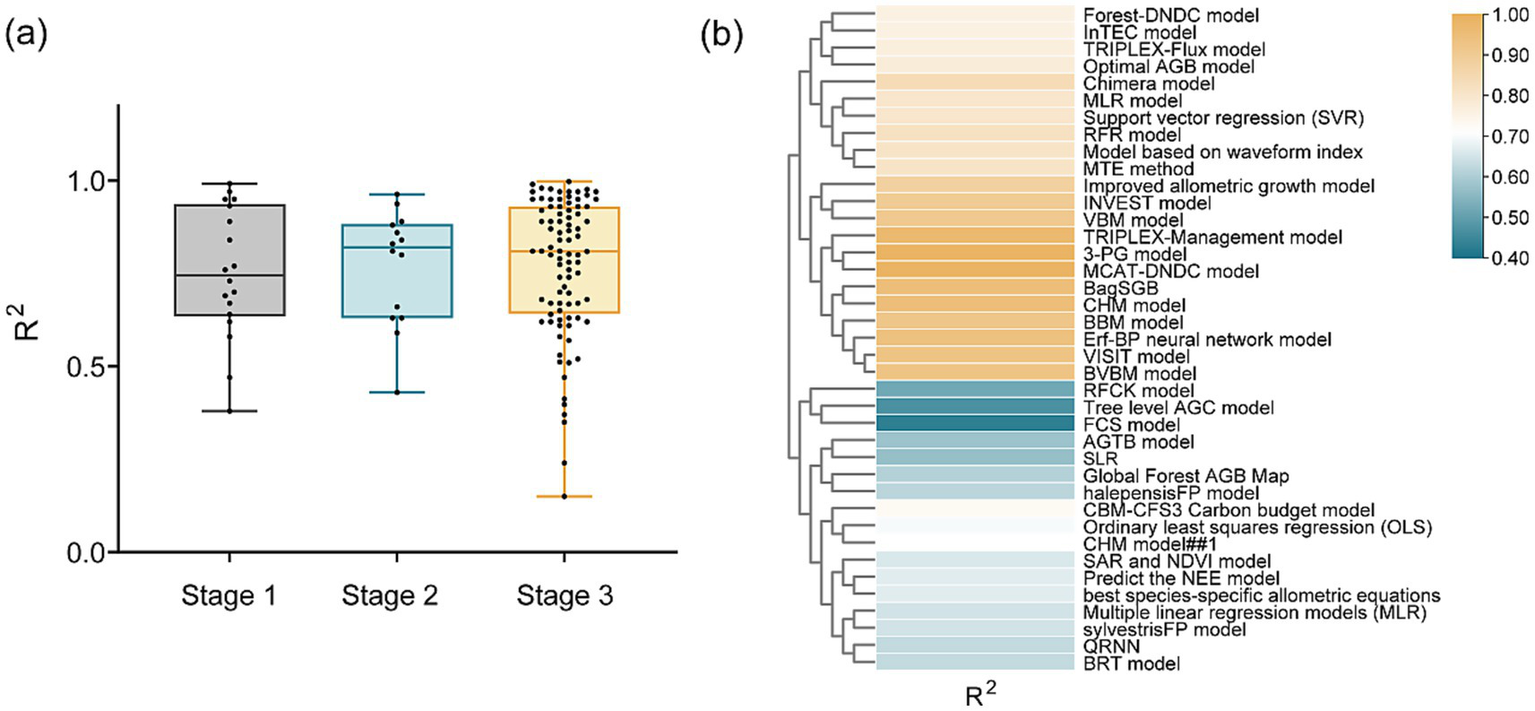 The results revealed that environmental sciences accounted for the largest share of publications (n = 718). The most productive institution and country were the Chinese Academy of Sciences (n = 208) and the United States (n = 691), respectively. Research progress in the field was categorized into three distinct stages since 2008. The early stage (2008–2012) was dominated by eddy covariance, satellite remote sensing, and airborne radar. The middle stage (2013–2017) was characterized by greater use of process-based and statistical simulation models. In the later stage (2018–2025), techniques such as random forest (RF), machine learning and biomass mapping became more widely used. Over this period, model performance improved substantially, especially the coefficient of determination (R2) increased from 0.62 to 0.97 for the TRIPLEX-Flux C-exchange model and from 0.63 to 0.97 for RF models.