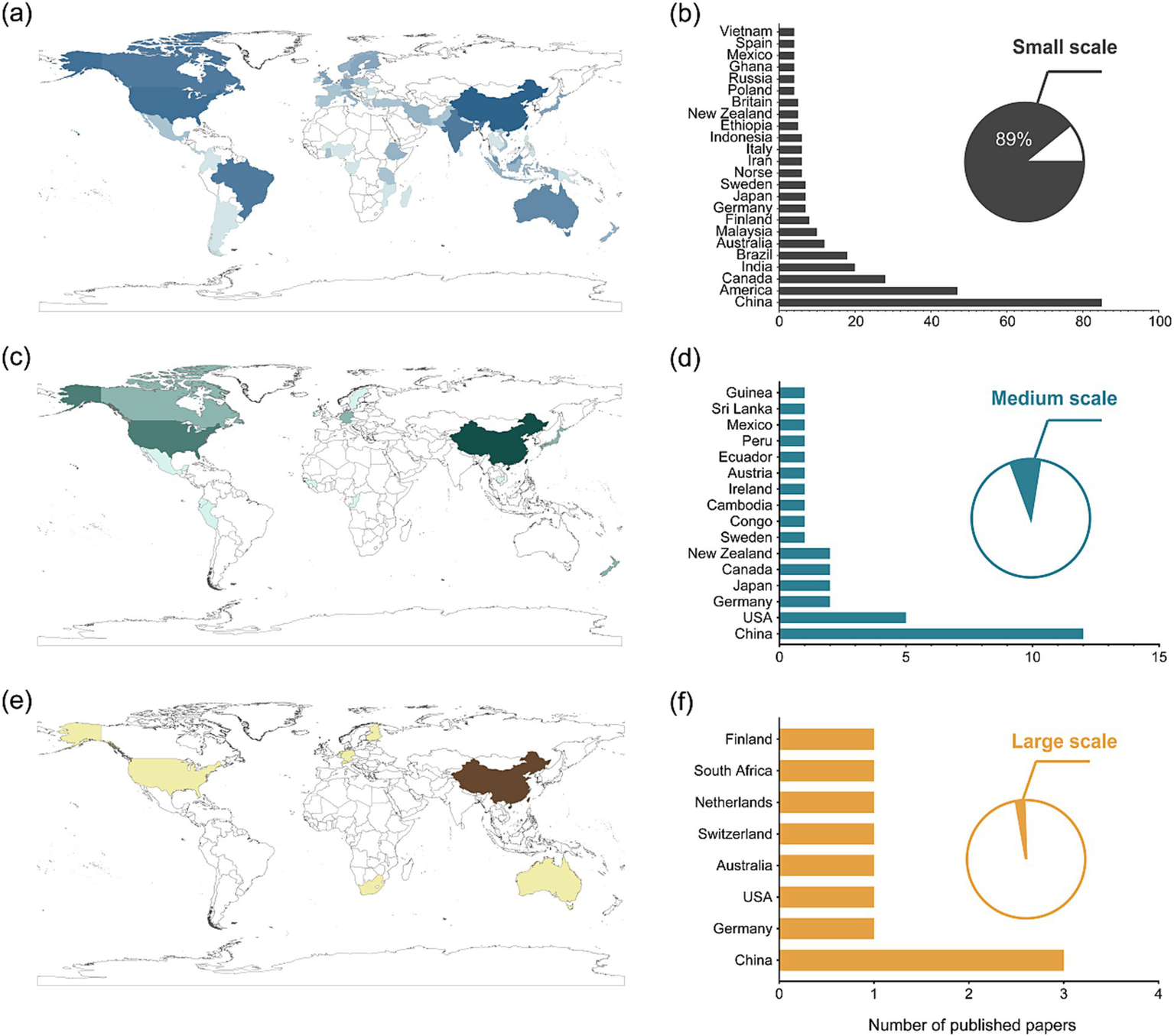 Trends in research on global forest carbon stock estimation at different scales (small, medium and large scales). (a) Number of publications on small-scale research. (b) Number of publications in individual countries corresponding to small-scale research. (c) Number of publications on medium-scale research. (d) Number of publications in individual countries corresponding to medium-scale research. (e) Number of publications on large-scale research. (f) Number of publications in individual countries corresponding to large-scale research. Deeper color indicates countries with a relatively higher number of published papers. The pie chart shows the proportion of studies on small, medium and large scales among the total literature.