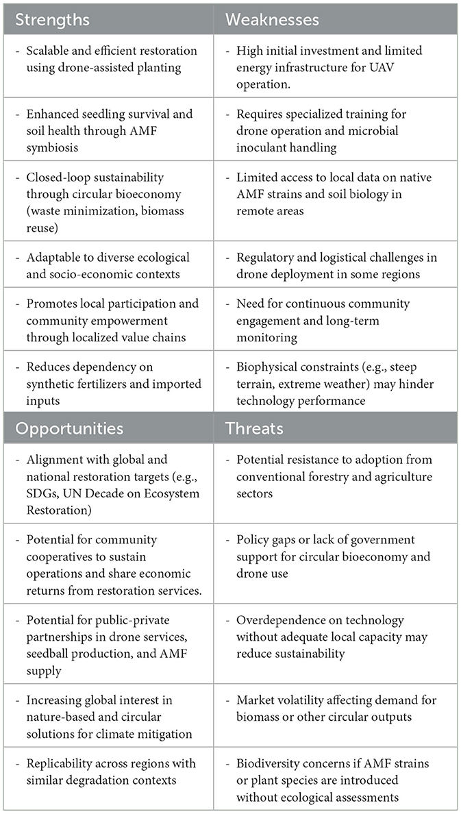 Each factor in the SWOT matrix is supported by evidence from various literature review (Table 1). To address weaknesses and threats, targeted actions such as capacity-building for drone operators, subsidies for renewable energy infrastructure, and ecological risk assessment protocols are recommended to strengthen long-term sustainability. The Integration of Cutting-Edge Technology, Nature-Based Soulutions and Circular Bioeconomy into landscape restoration presents numerous strengths. One of the primary advantages is its scalability and operational efficiency. Drone technology enables rapid and precise seed dispersal across large and inaccessible areas, significantly reducing labor costs and physical disturbance. When combined with AMF, the biological effectiveness of restoration increases—AMF symbiosis improves seedling survival, enhances nutrient and water uptake, and promotes long-term soil health. Furthermore, the circular bioeconomy framework reinforces ecological sustainability by minimizing waste, reusing biomass, and promoting localized resource cycles. This system is adaptable to a wide range of ecological and socio-economic contexts, allowing for flexible implementation in diverse restoration scenarios. It also encourages community participation by integrating local actors into seedball production, drone operation, and AMF cultivation, thereby creating green jobs and strengthening local economies. Additionally, this approach reduces dependency on synthetic fertilizers and imported materials by promoting natural and locally-sourced inputs. Furthermore, community-based cooperatives and partnerships can sustain operations by channeling returns from restoration services, biomass sales, or government incentive programs.