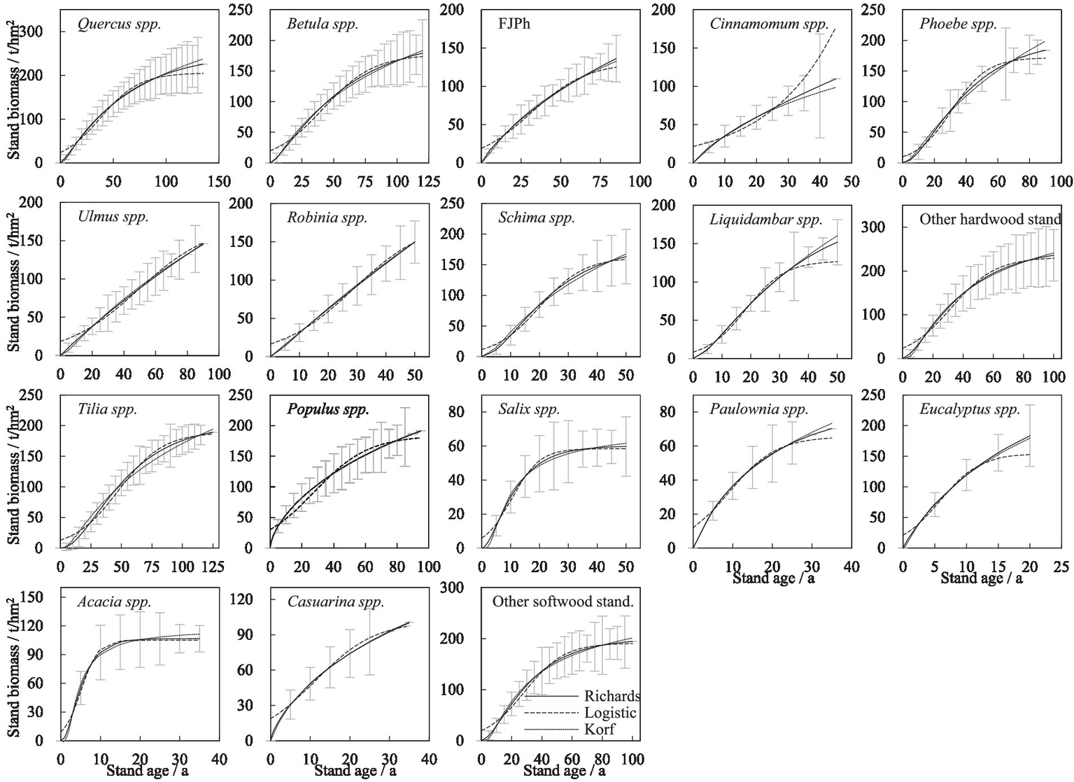 | Populus spp. | Richards, Eq1 | 341.3841 | 0.0052 | 0.6139 | 0.96 | 11.50 |