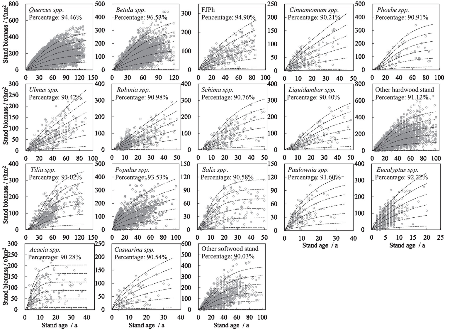 Scatter plots of stand average age and forest biomass data were drawn and overlaid onto the site productivity curve cluster. The probability that the scatter points fall inside the area enclosed by the curves represents the explanatory power of the site productivity table regarding forest biomass growth. The probability greater than 90% is generally considered sufficient for the established site productivity model to meet practical use requirements (Li, 2019). If the result is below this threshold, adjustments on the models should be made.