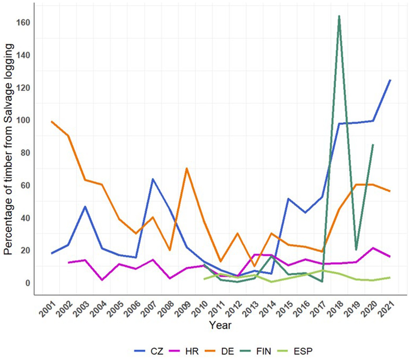 Figure 2. Percentage of salvage logging (m3) related to timber supply, in the five case studies (CZ, HR, DE, FIN, and ESP). When the percentage of salvage logging to timber supply is close to 100, it indicates that a larger portion of timber is from salvage logging likely due to disturbances (e.g., bark beetle, windstorms, fires, snow, etc.) that led to much higher salvage operations than originally anticipated, whereas a percentage close to 0 suggests that the timber supply is largely sourced from the planned logging.