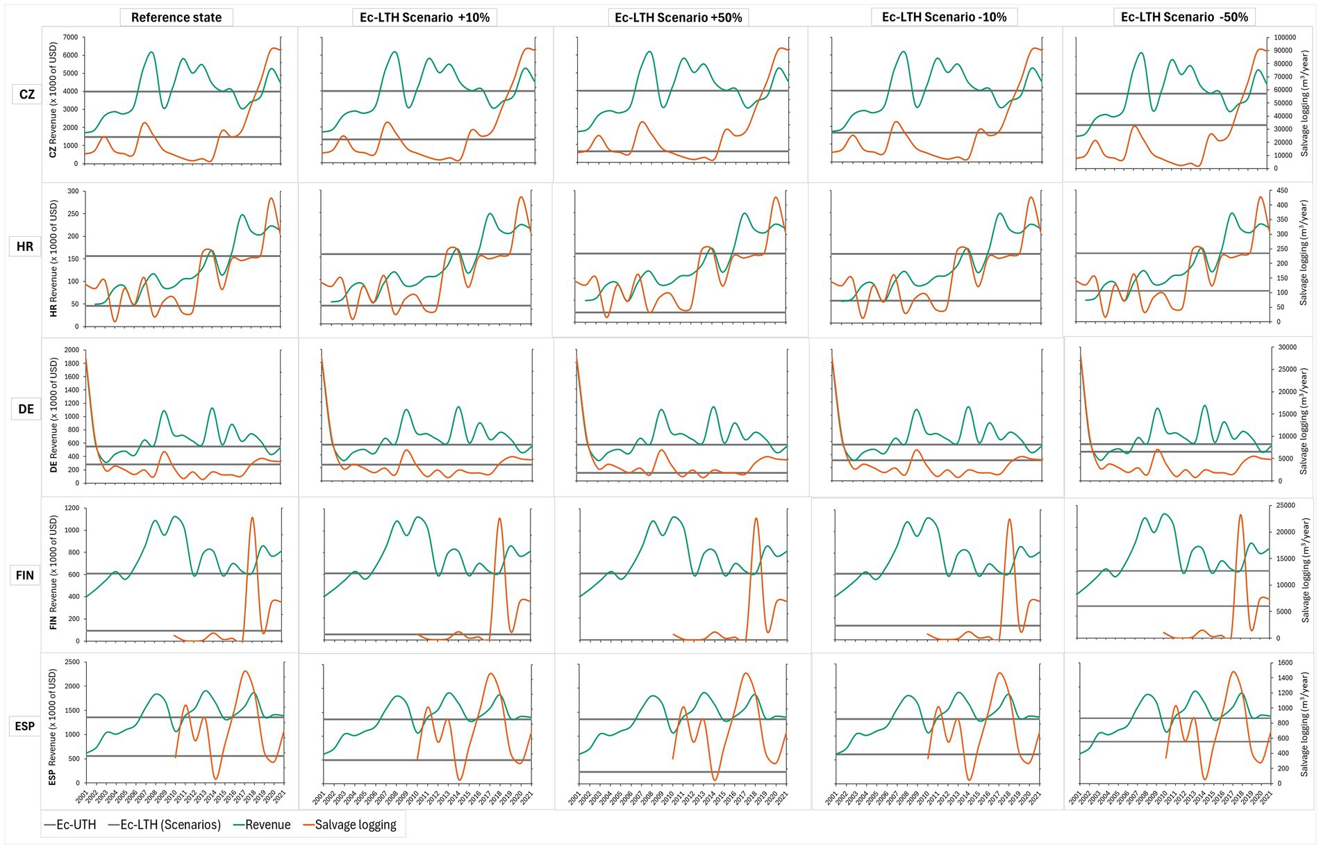 Figure 4. Resilience assessment for CZ, HR, DE, FIN, and ESP from 2001 to 2021. The green line shows the revenue; the orange line represents salvage logging volume, a proxy of disturbance level, and the grey lines indicate the upper (Ec.UTH) and lower thresholds (Ec. LTH), specific for each case study, which depicts each case study’s ability to maintain the revenue within certain levels (see Methods) thresholds despite natural disturbances. The first column “Reference state” displays the baseline thresholds, while the subsequent columns illustrate the sensitivity scenarios, where the Ec. LTH was adjusted by ±10 and ±50% to test the robustness of profitability assumptions.