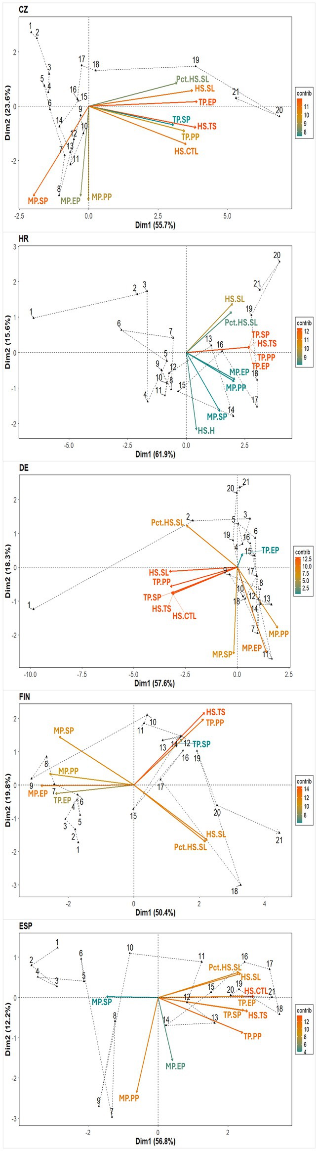 Figure 5. Biplot of principal component analysis (PCA), for each case study (CZ, HR, DE, FIN, and ESP) considering predictors of revenue (represented by arrows). Arrows illustrate the direction and the magnitude of each variable’s influence. The respective contributions of these variables to revenue are indicated by a color gradient. The observations, depicted as dots, correspond to different years, where “1” corresponds to the year 2001 and “21” to 2021. Temporal trajectories are shown by chronologically connecting yearly points to highlight transitions within their respect case study over time. The complete names of the variable abbreviations are provided in Table 1 of section “2”.