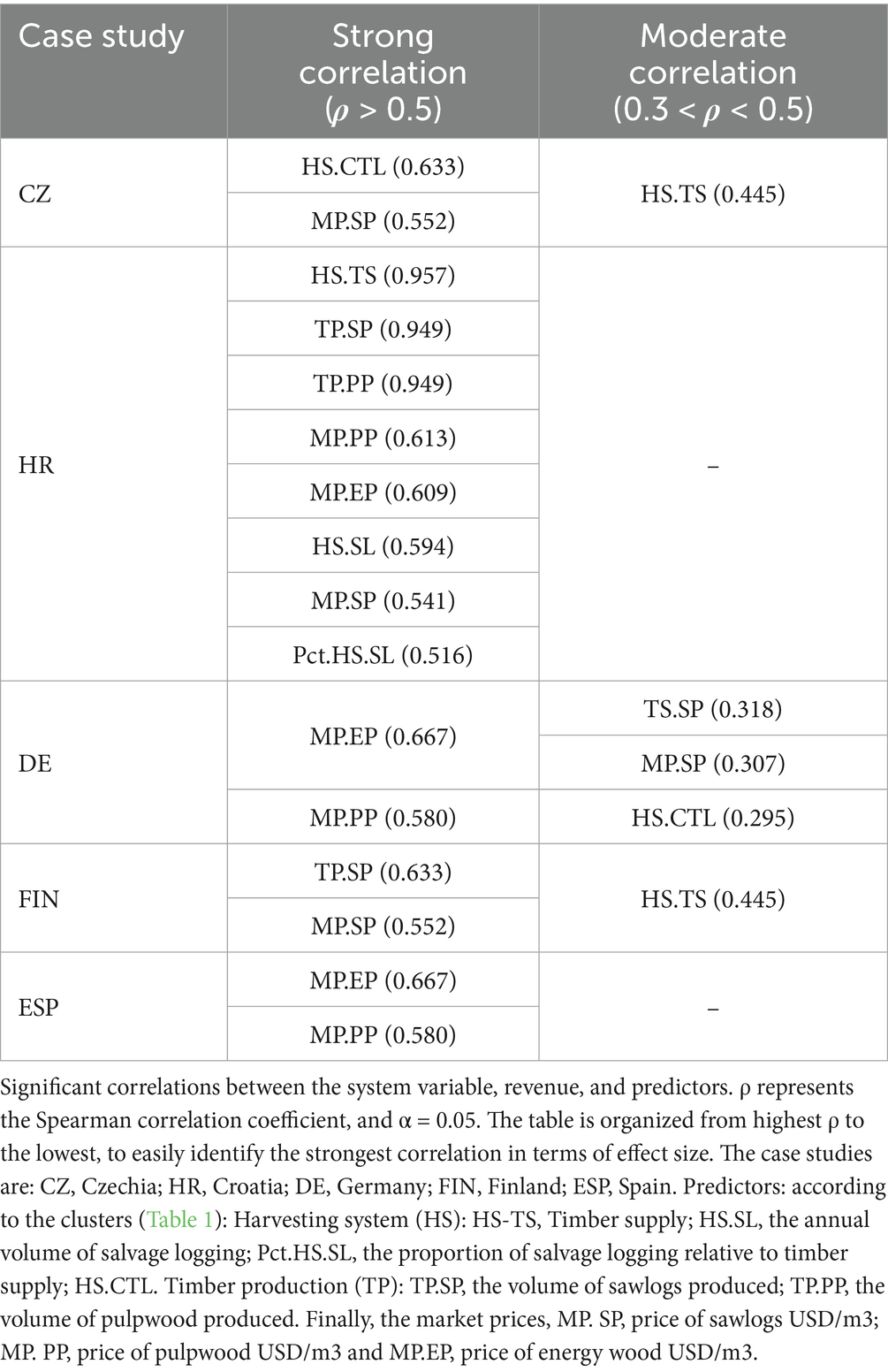 Regarding timber production variables, sawlog volume (TS.SP) displayed a strong positive correlation with revenue in HR and a moderate correlation in DE and FIN. Pulpwood volume (TP.PP) showed a significant correlation in HR. Market prices demonstrated significant correlations across several regions. Sawlog prices (MP.SP) showed a strong positive correlation in CZ and HR. Pulpwood prices (MP.PP) and Energy wood prices (MP.EP) were significantly correlated with revenue in HR, DE and ESP. For more detailed information about the correlation between the system variable, revenue, and the predictors, please go to Annex III.