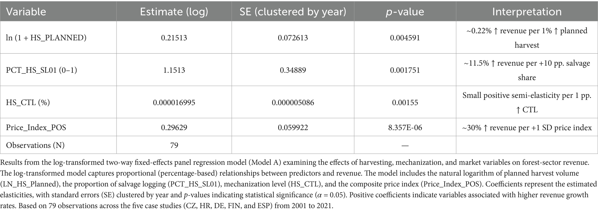 The fixed-effects model was particularly valuable in isolating within-country temporal variation, thereby minimizing bias from structural differences such as ownership regimes, institutional frameworks, or ecological conditions (Wooldridge, 2010). This approach allowed for more accurate identification of the key dynamic factors influencing revenue stability across time rather than across regions. By controlling unobserved heterogeneity, the model strengthens the robustness of the observed relationship between harvesting intensity, mechanization, and price trends; factors previously highlighted as central to forest sector resilience (Hanewinkel et al., 2014; Blattert et al., 2023). Consequently, the fixed-effects model results provide a solid empirical foundation for linking observed market responses to adaptive management mechanisms within national FVCs.