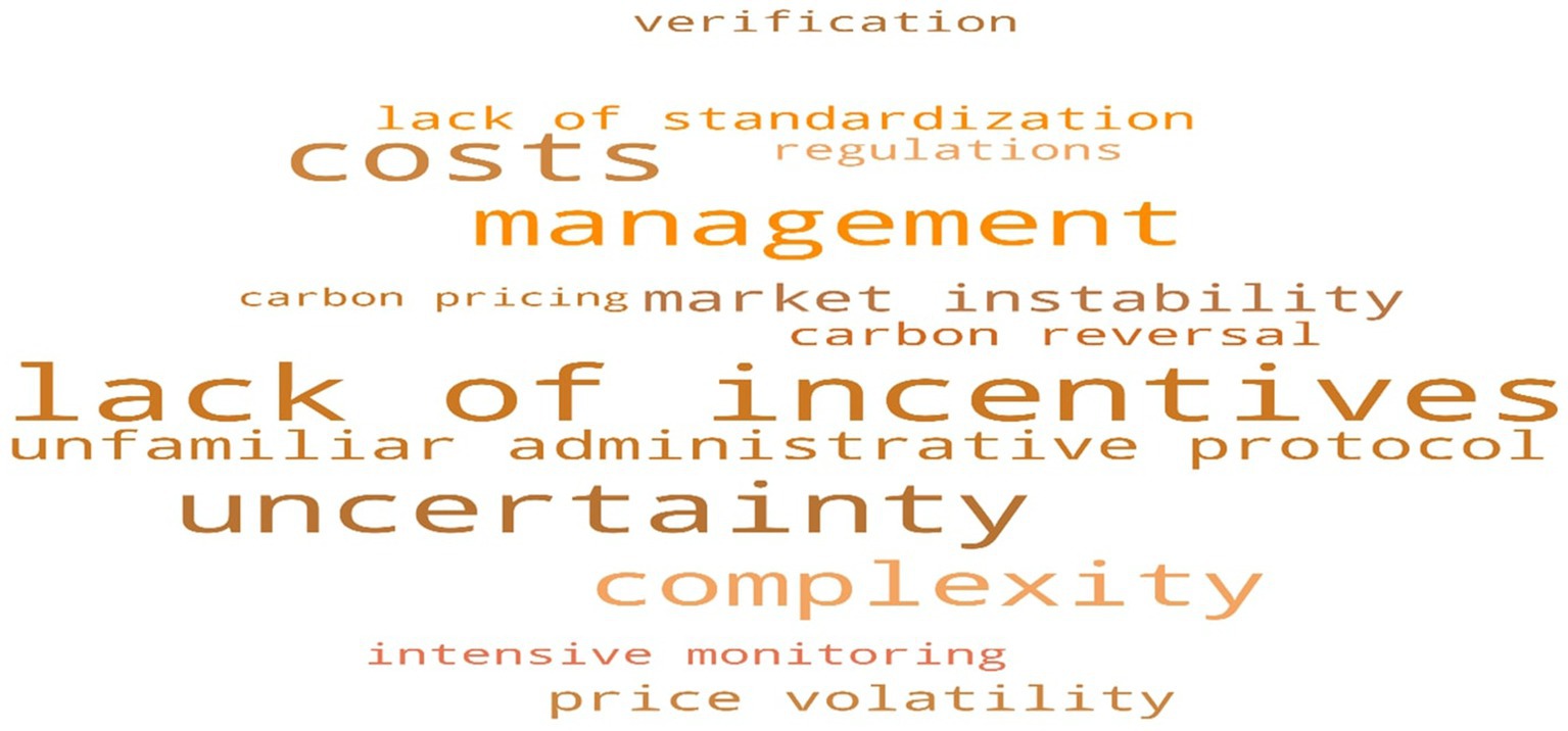 Figure 2. Word cloud illustrating key barriers to participation in forest carbon markets. The most prominent phrases include ‘lack of incentives,’ ‘uncertainty,’ ‘costs,’ ‘management,’ ‘complexity,’ ‘lack of standardization,’ ‘market instability,’ and ‘price volatility.’ The relative size of each phrase reflects its frequency in participant responses.