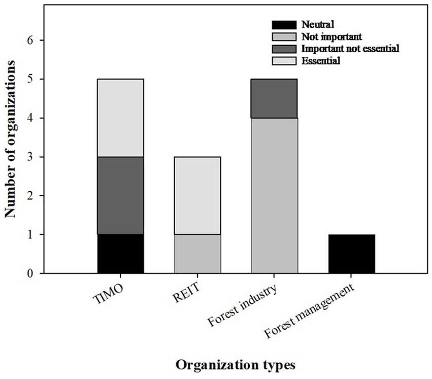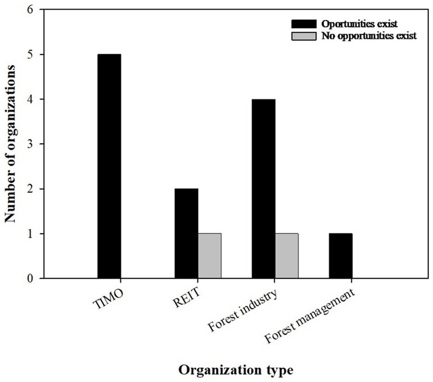 Most participants indicated that opportunities currently exist for them to engage in forest carbon markets, a perspective shared across all organizational types (Figure 3). TIMOs and forest industry firms expressed particularly optimistic views, while REITs conveyed more mixed responses. Although underrepresented, the forest management organization also reported a positive outlook. These findings suggest a generally favorable perception of carbon market opportunities among commercial forestry organizations. However, the variation in responses highlights how organizational context and strategic priorities influence whether companies view carbon market participation as feasible or advantageous.