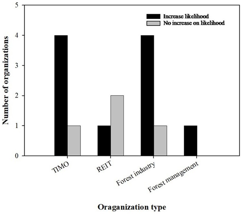 Figure 4. Bar chart showing the influence of government incentives on the likelihood of organizations participating in forest carbon markets, broken down by organization type. TIMO and forest industry groups report increased likelihood with incentives, while some REIT and forest management groups indicate no increase.
