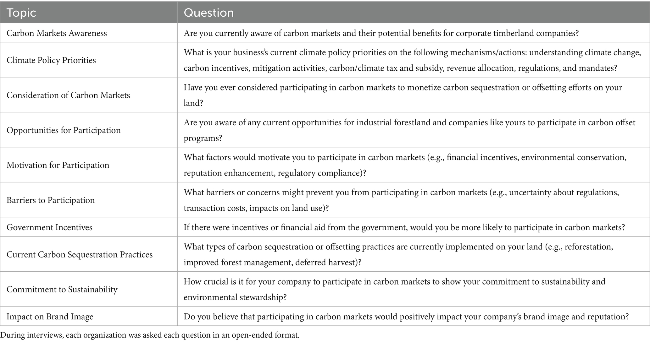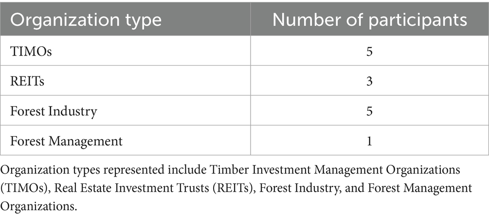 To assess perspectives on carbon market programs, we conducted interviews with decision-makers from four types of organizations involved in U. S. commercial forestry: TIMOs, REITs, forest industry firms (companies primarily engaged in processing and manufacturing timber, paper, and other wood-based products for commercial use), and forest management companies (organizations focused on the sustainable oversight of forestlands, including timber harvesting, conservation practices, and land stewardship). We developed an interview protocol using guidance from Qualitative Inquiry (Charmaz, 2006) and Research Design (Creswell and Poth, 2016). Following a semi-structured format, we asked qualitative and open-ended questions focused on familiarity with carbon programs, current participation or interest, perceived benefits and challenges, and strategies for integrating sustainable forest management into timber operations (Blandford, 2013).