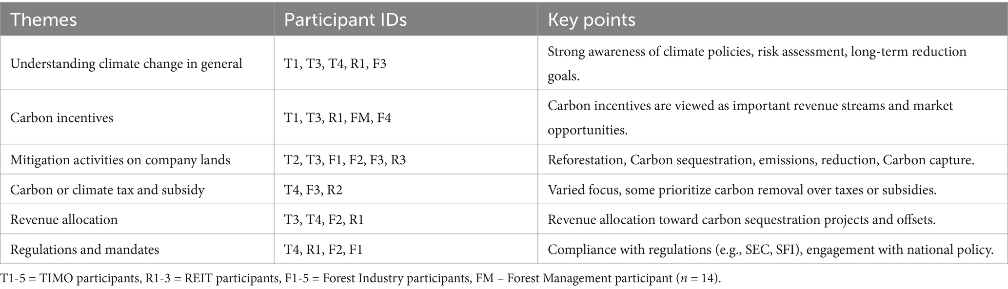 We categorized the participating companies into four groups: TIMOs, REITs, forest industry companies, and forest management companies. To maintain clarity and consistency while protecting the anonymity of organizations, we assigned a unique participant identification (ID) to each interviewee based on their organization type. The coding system used the following structure: T for TIMOs (e.g., T1, T2, T3), R for REITs (e.g., R1, R2, R3), F for forest industry companies (e.g., F1, F2, F3), and FM for forest management companies (e.g., FM1) (see Table 2).