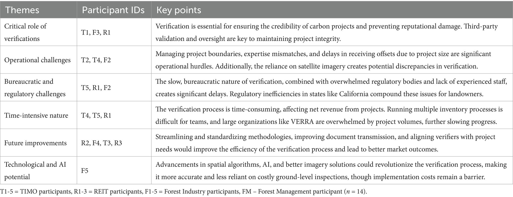 Forest industry participants shared similar frustrations regarding verification processes. F2 noted that the small scale of some carbon projects led to significant delays in receiving verified offsets. F3 added that while remote sensing and periodic measurements are essential, applying these techniques consistently across diverse projects remains a challenge. Bureaucratic complexity was a recurring theme. T5 described the carbon market’s verification protocols as overly bureaucratic and poorly aligned with traditional forest management practices, which creates unnecessary friction. R1 pointed out that organizations like Verra (Verified Carbon Standard) and ACR (American Carbon Registry) are overwhelmed by the volume of project verifications, contributing to widespread delays. R2 emphasized that the verification process often involves such complex infrastructure requirements that it becomes inaccessible for smaller-scale projects.