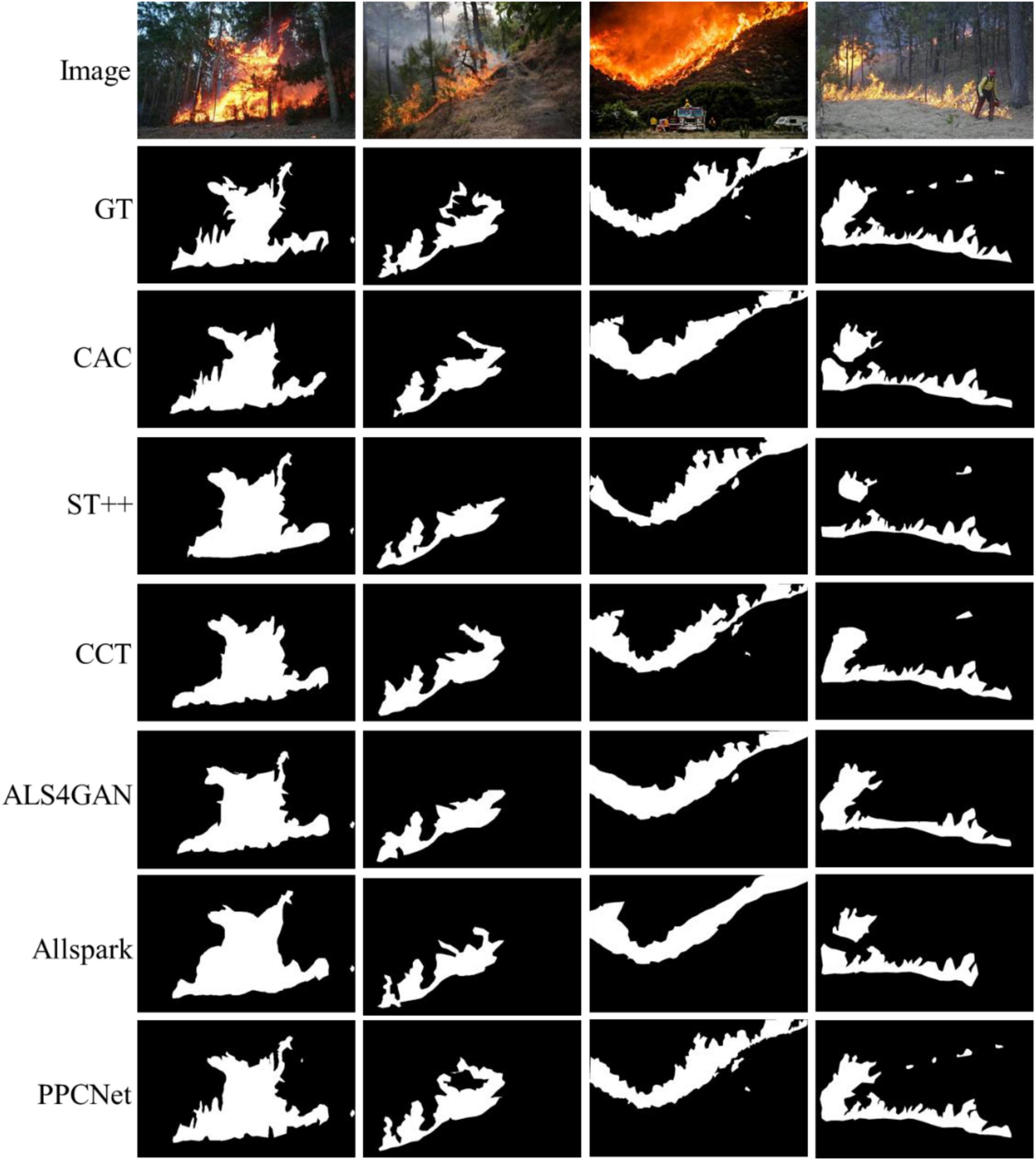 To comprehensively verify the performance advantages of the PPCNet model for forest fire image segmentation, five representative semi-supervised semantic segmentation methods are selected for comparison, including CAC (Lai et al., 2021), ST++ (Yang et al., 2022), CCT (Ouali et al., 2020), ALS4GAN (Desai and Ghose, 2022), and Allspark (Wang H. et al., 2024). These methods are widely recognized in semi-supervised image segmentation and have been extensively applied in complex scenarios such as remote sensing, providing strong reference value. The experiments are conducted on four publicly available aerial remote sensing forest fire datasets. The same data splitting strategy and evaluation metrics are adopted to ensure the fairness and comparability of the experimental results. Specifically, the training sets are divided into different proportions of labeled and unlabeled data (8:2, 7:3, and 5:5) to simulate real-world scenarios with varying degrees of annotated data availability, thereby further testing the stability and robustness of the models under different data conditions.