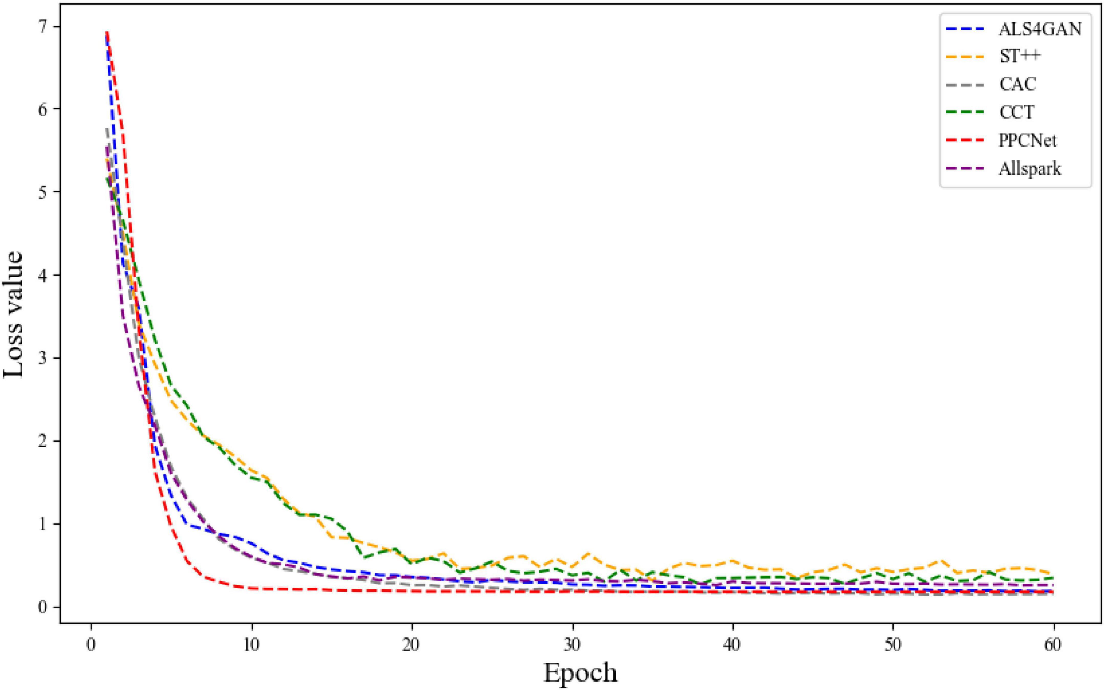 To further verify the training stability and optimization efficiency of PPCNet, a convergence analysis was conducted by comparing it with five representative semi-supervised segmentation methods, namely CAC, ST++, CCT, ALS4GAN, and Allspark, on the D-Fire dataset. In this experiment, the ratio of labeled to unlabeled data was set to 5:5. All models were trained under identical parameter configurations and data conditions, and the variation curves of training loss were recorded throughout the process, as shown in Figure 10. From the overall trend, it can be observed that PPCNet maintains a consistently lower loss value throughout the entire training process and achieves significantly faster convergence compared to other methods. Specifically, within the first 20 epochs, the loss value of PPCNet rapidly decreases to approximately 0.18, which is notably lower than that of CAC (approximately 0.27), Allspark (approximately 0.34), and ALS4GAN (approximately 0.37) over the same period. In contrast, both ST++ and CCT exhibit relatively slower declines in loss and more substantial fluctuations during the early training stages, indicating inferior stability.