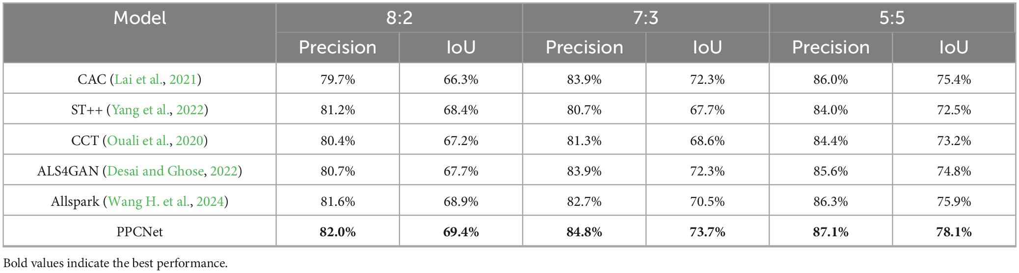 The results clearly show that PPCNet achieves the best performance across all labeled-unlabeled data proportions in both Precision and IoU metrics. Particularly under the most challenging 5:5 split with 50% unlabeled data, PPCNet achieves an IoU of 85.6% and Precision of 92.1%, highlighting its outstanding stability and robustness under different levels of labeled data availability. Furthermore, ALS4GAN and ST++ demonstrate competitive performance, with ST++ even outperforming ALS4GAN in IoU under 7:3 and 5:5 splits, indicating its advantage in semi-supervised learning. CCT and Allspark deliver moderate performance, while CAC consistently performs the weakest.