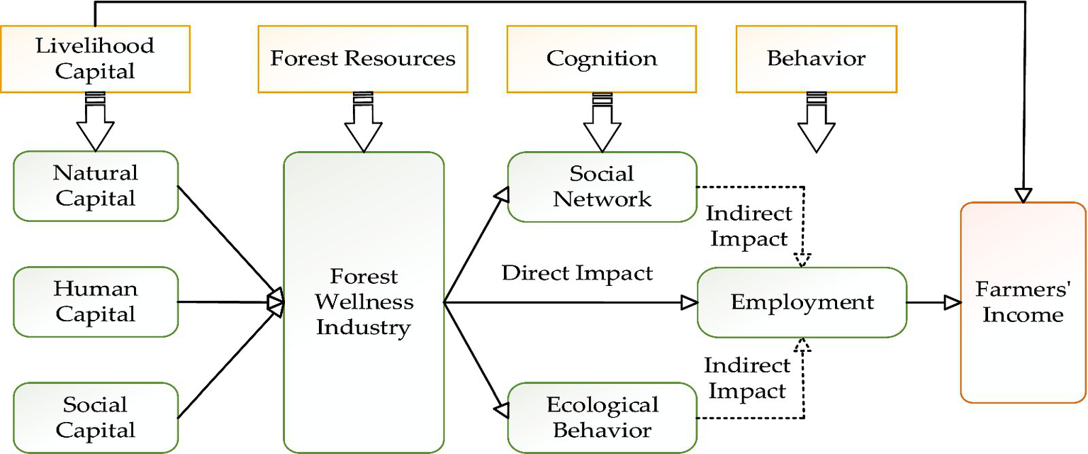 This study develops a “Sustainable Livelihoods–Behavioral Response” framework by integrating the Sustainable Livelihoods Approach (SLA) and Farm Household Behavior Theory. The sustainable livelihoods theory emphasizes that households achieve income growth through the combination and transformation of various livelihood capitals, such as natural capital, human capital, and social capital (Li et al., 2020). Forest therapy reconstructs rural household income structures through a triple-path mechanism—optimizing labor resource allocation, changing ecological behaviors, and strengthening social networks.