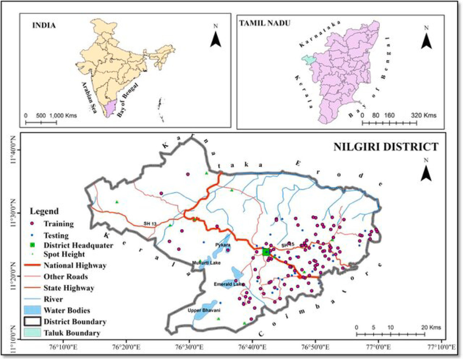 Study area map showing the Nilgiris district at National and Local Scales. Source: Yuvaraj and Dolui (2021).