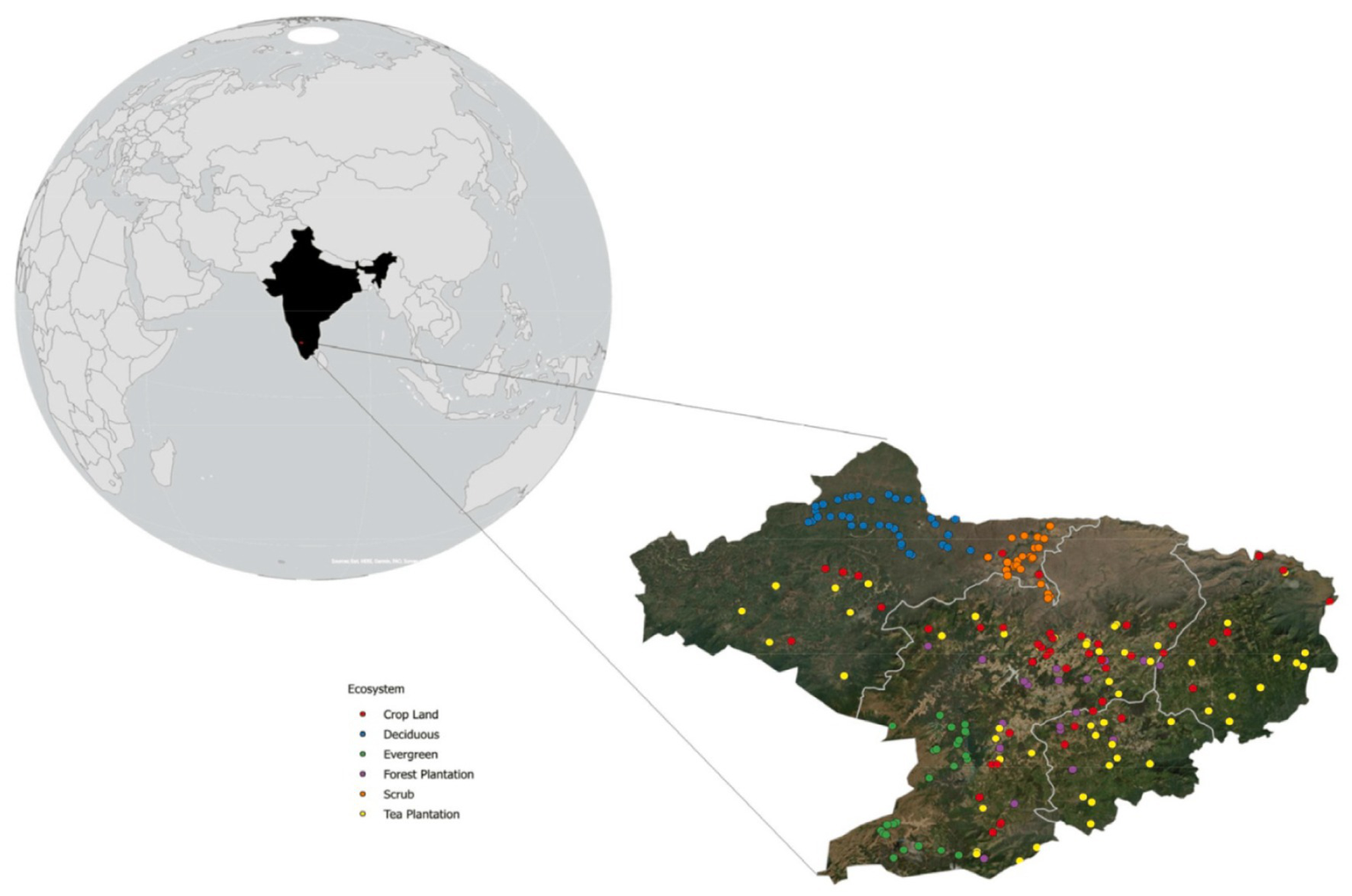 The Nilgiris district is located in the northwestern part of Tamil Nadu state, India, forming part of the Western Ghats biodiversity hotspot (11°08′ to 11°32’ N latitude and 76°27′ to 77°00′E longitude). The district covers an area of 2,549 km2 with elevations ranging from 900 to 2,636 meters above mean sea level, creating diverse ecological zones from subtropical forests at lower elevations to temperate grasslands and montane forests at higher altitudes. The region experiences a tropical montane climate with annual rainfall ranging from 1,500 to 3,000 mm, distributed across both southwest monsoon (June–September) and northeast monsoon (October–December) periods. Mean annual temperatures vary from 15 °C to 20 °C, with occasional frost in winter months at higher elevations. This unique climate supports diverse vegetation types including tropical wet evergreen forests, subtropical montane forests, temperate grasslands (shola-grassland ecosystem), and extensive plantation crops (Figure 2).