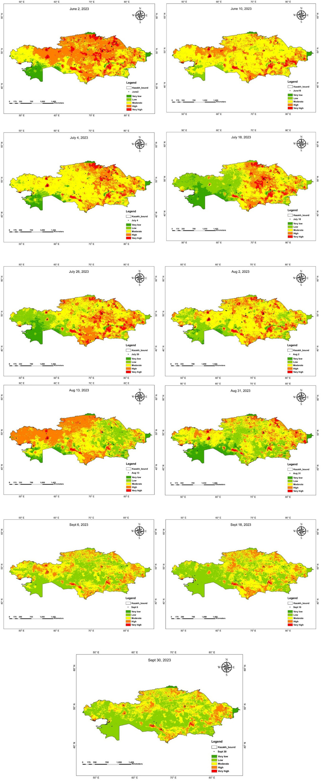 The developed SFRI provides a comprehensive assessment of fire risk across Kazakhstan. This spatial layer can assist authorities in prioritizing resources and focusing their efforts on areas with a higher likelihood of fire occurrence (Akther and Hassan, 2011). The SFRI maps were generated during the 2023 fire season, and the selected maps have been overlaid with the corresponding MODIS fire incidents, as shown in Figure 3. These maps were generated daily to provide a thorough and operationally relevant assessment of fire danger throughout the season. However, Figure 3 presents only a limited selection of dates to demonstrate the model’s accuracy during specific, representative instances.
