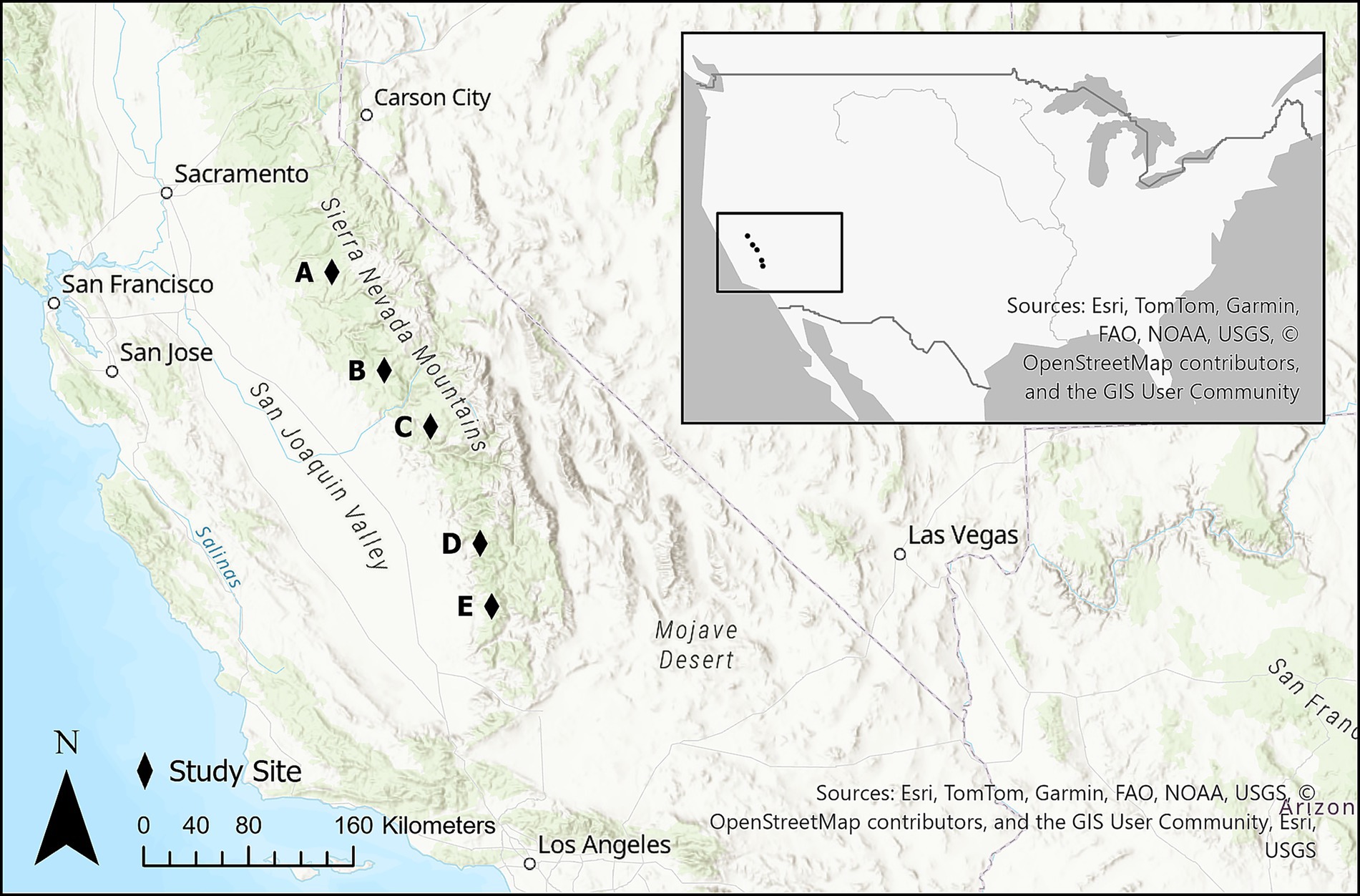 Figure 1. Distribution of field sites across the central and southern Sierra Nevada, California, USA: (A) Longbarn, (B) Bass Lake, (C) Dinkey Creek and Southern California Edison, (D) Mountain Home Demonstration State Forest, (E) Spear.